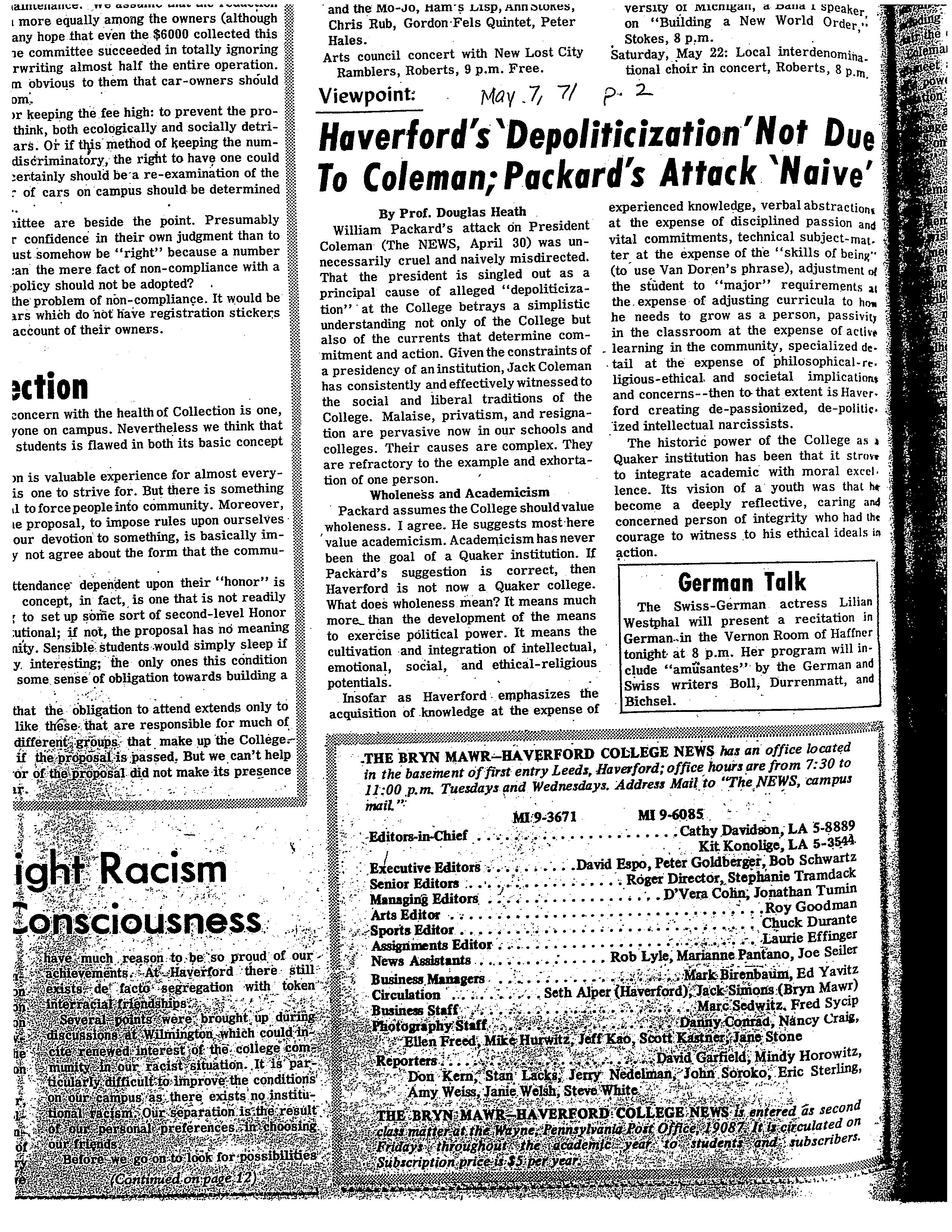 Professor Douglas Heath, “Haverford's 'Depoliticization' Not Due to Coleman; Packard's Attack 'Naive',” HIST H252 The History of Haverford College: Conflict, Consensus and the Liberal Arts, accessed December 21, 2025, https://ds-omeka.haverford.edu/annotations/items/show/120.