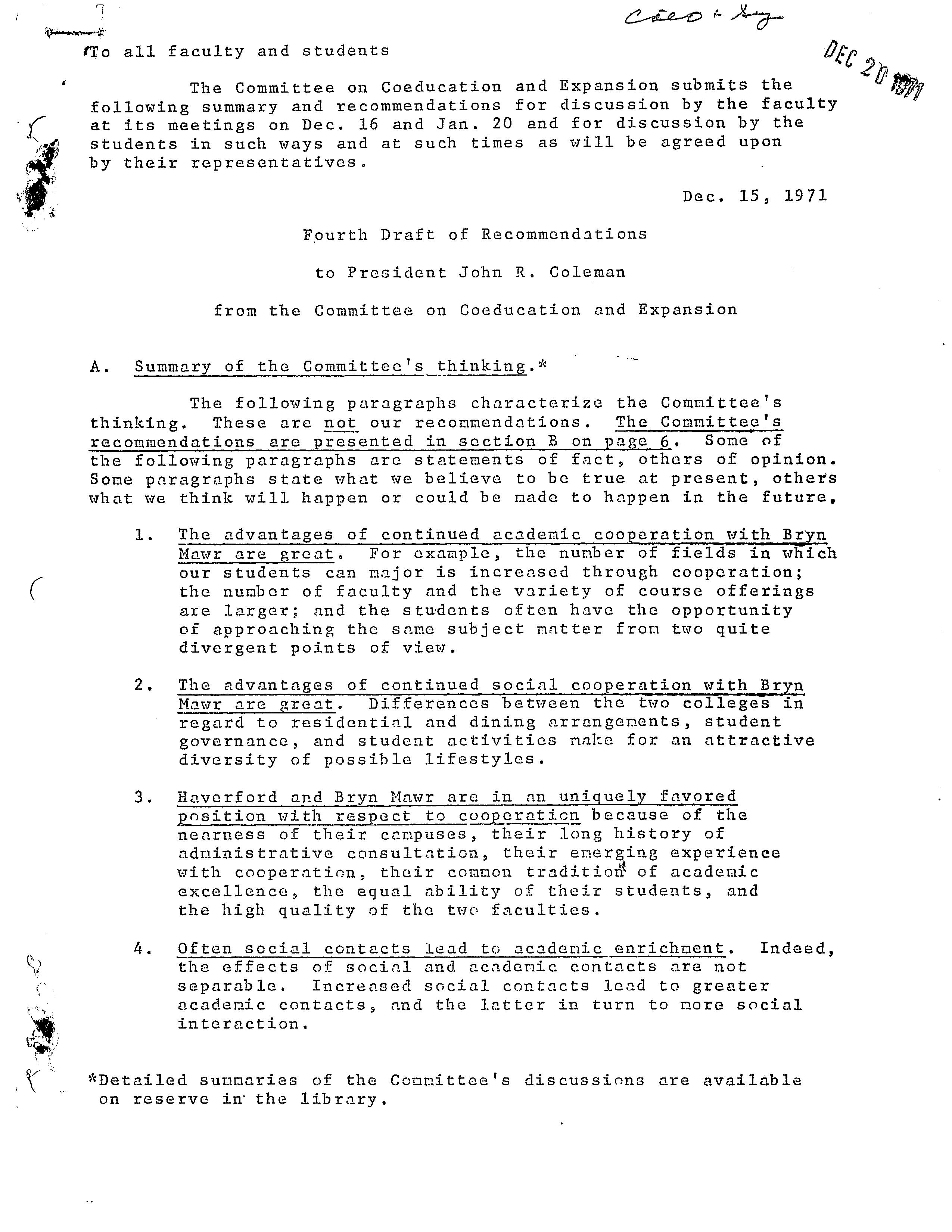 Fourth Draft of Recommendations to President John R. Coleman from the Committee on Coeducation and Expansion