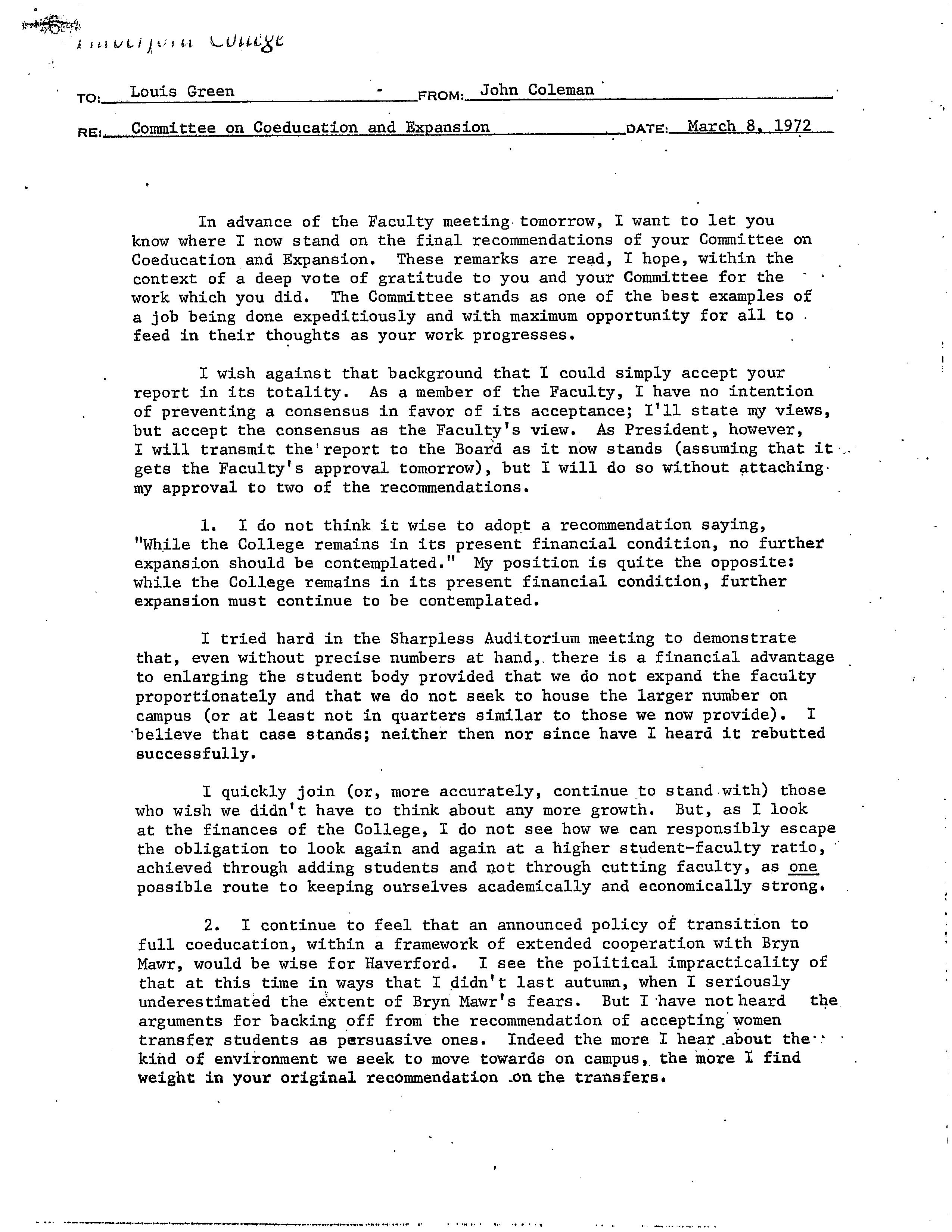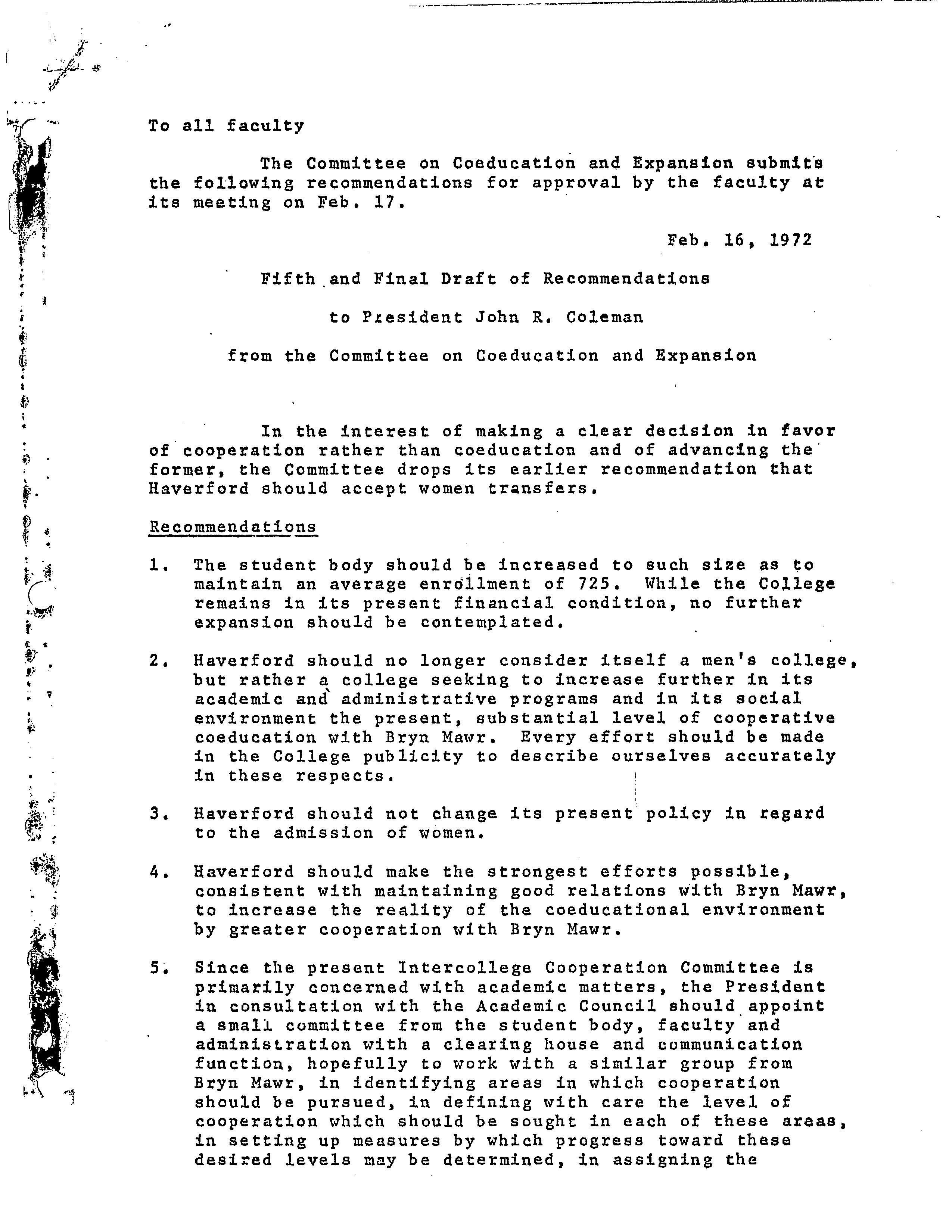 The Committee on Coeducation and Expansion, “Fifth and Final Draft of Recommendations to President John R. Coleman from the Committee on Coeducation and Expansion,” HIST H252 The History of Haverford College: Conflict, Consensus and the Liberal Arts, accessed December 21, 2025, https://ds-omeka.haverford.edu/annotations/items/show/147.