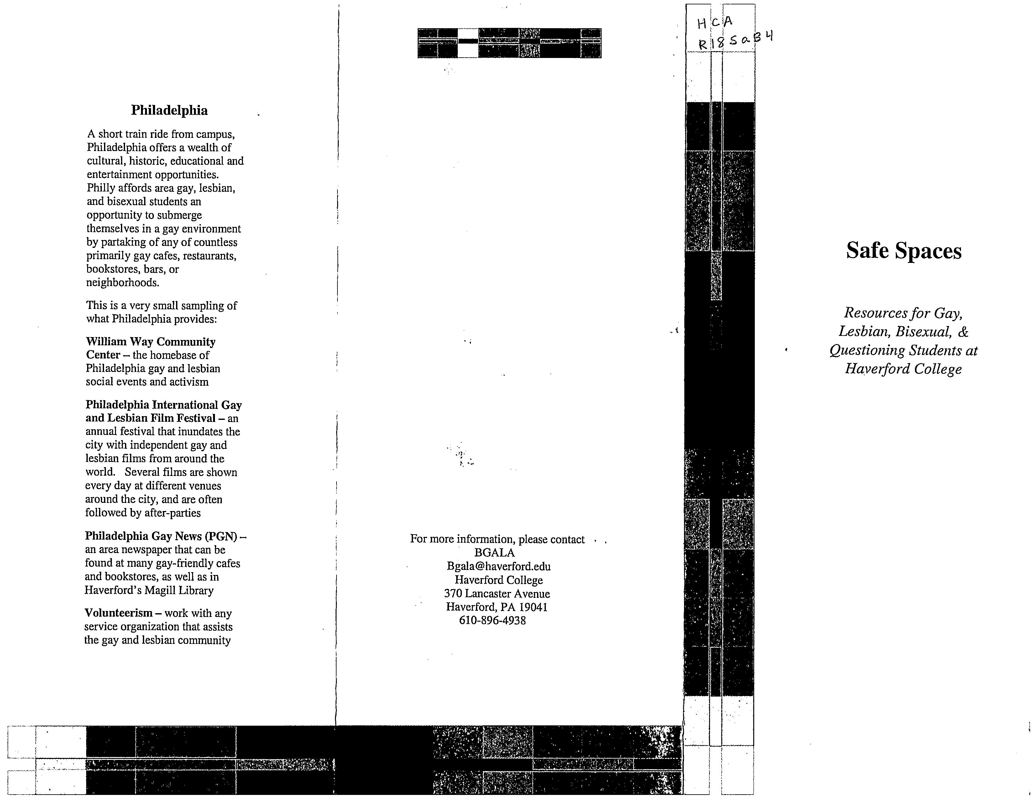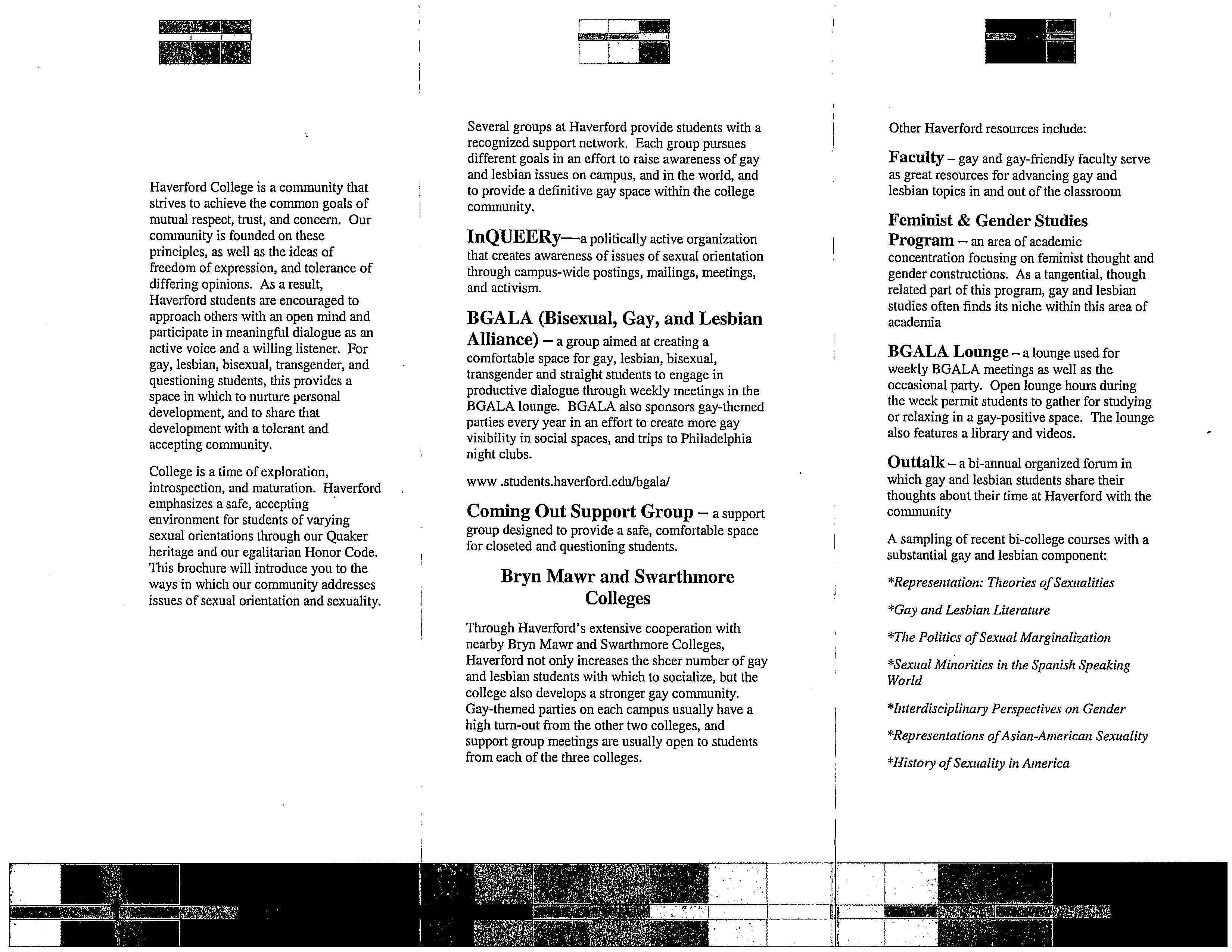 BGALA (Bisexual- Gay- and Lesbian Alliance), “Safe Spaces: Resources for Gay- Lesbian- Bisexual- & Questioning Students at Haverford College,” HIST H252 The History of Haverford College: Conflict, Consensus and the Liberal Arts, accessed December 21, 2025, https://ds-omeka.haverford.edu/annotations/items/show/156.