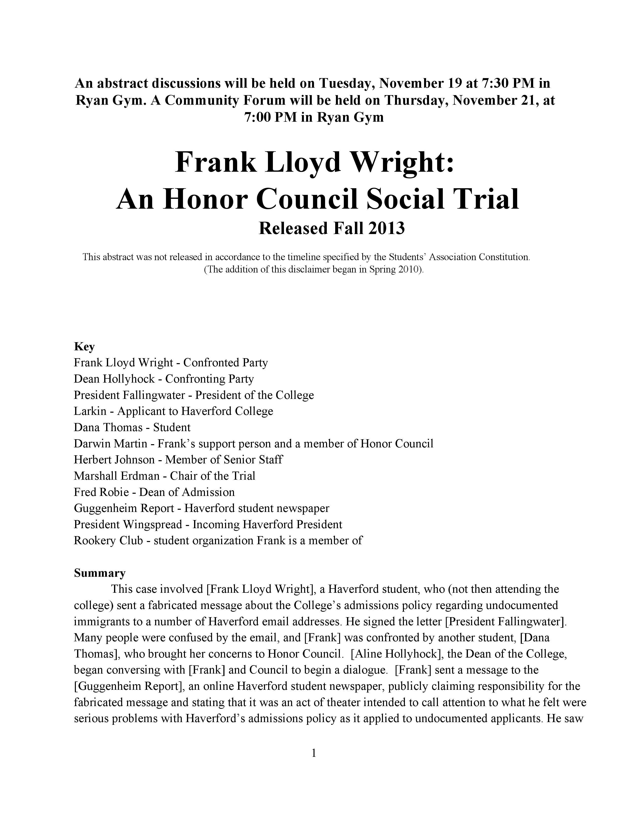 Haverford College Honor Council , “Frank Lloyd Wright: An Honor Council Social Trial,” HIST H252 The History of Haverford College: Conflict, Consensus and the Liberal Arts, accessed December 21, 2025, https://ds-omeka.haverford.edu/annotations/items/show/170.