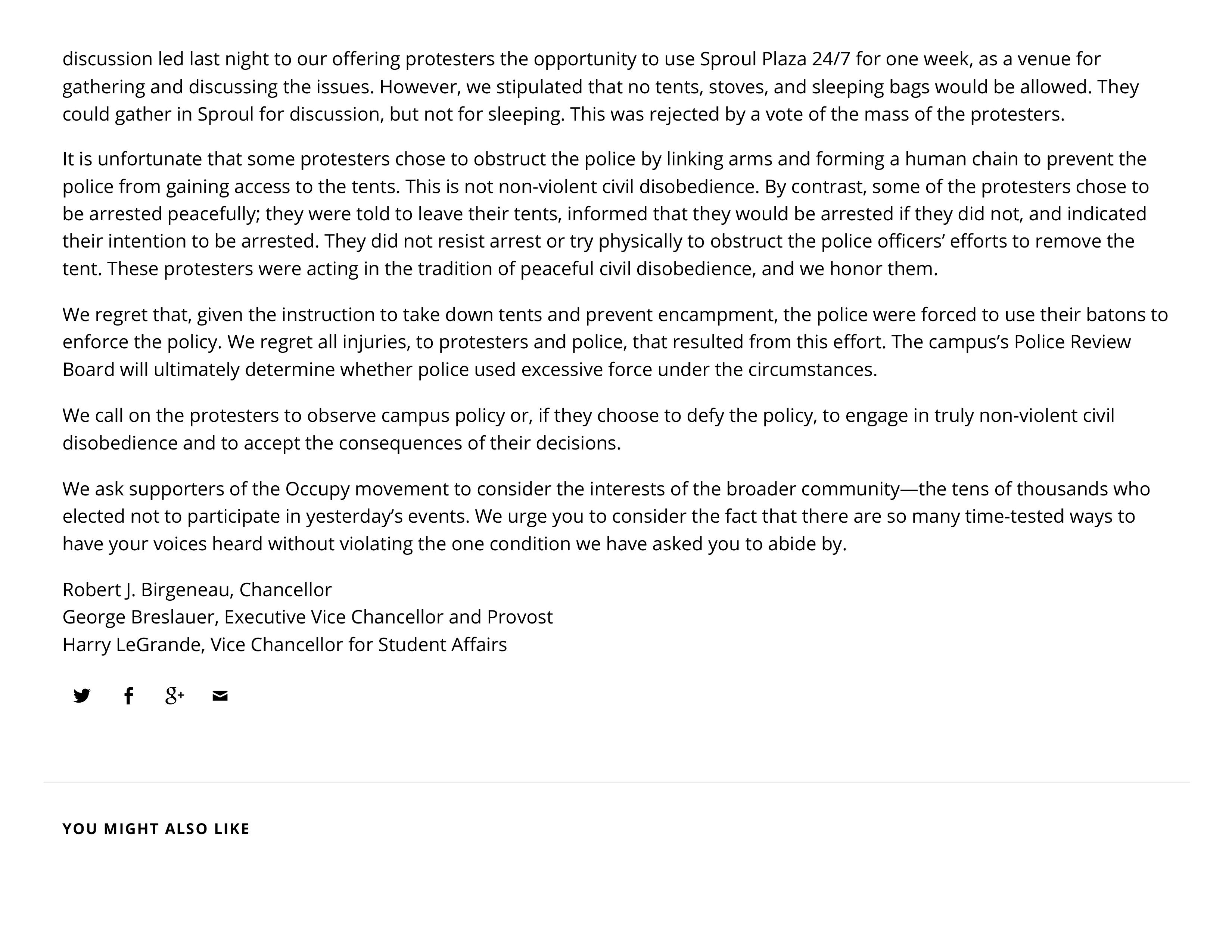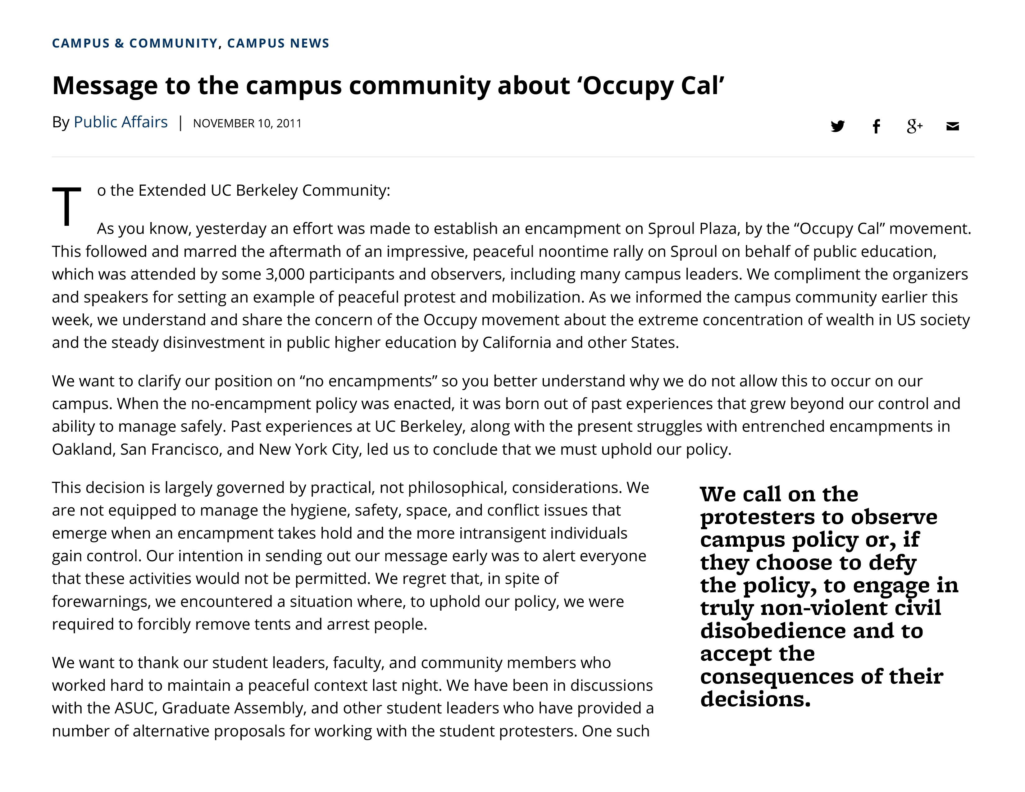 Public Affairs- UC Berkeley, “Message to the Campus Community about 'Occupy Cal',” HIST H252 The History of Haverford College: Conflict, Consensus and the Liberal Arts, accessed December 21, 2025, https://ds-omeka.haverford.edu/annotations/items/show/185.
