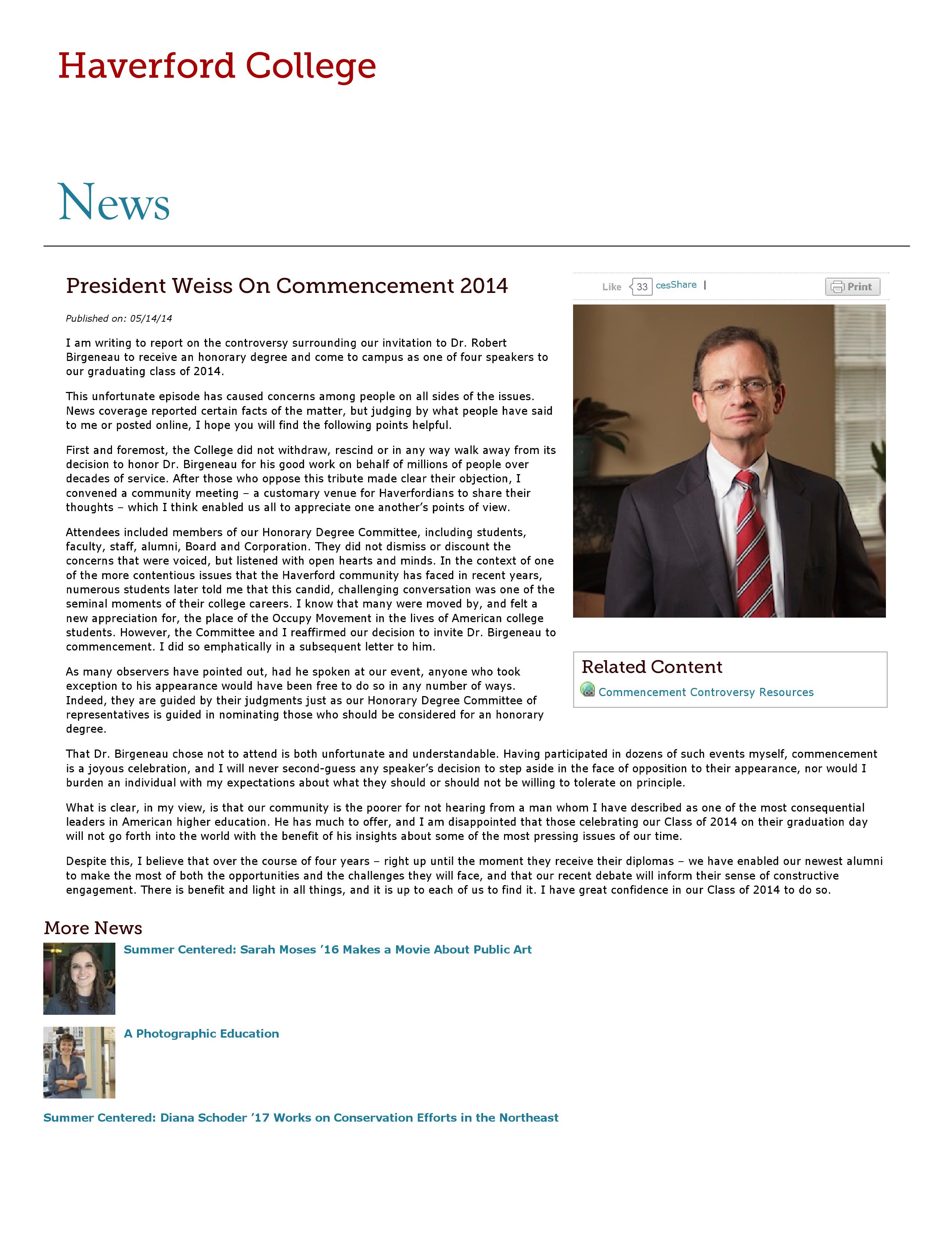 Daniel Weiss, “President Weiss on Commencement 2014,” HIST H252 The History of Haverford College: Conflict, Consensus and the Liberal Arts, accessed December 21, 2025, https://ds-omeka.haverford.edu/annotations/items/show/193.