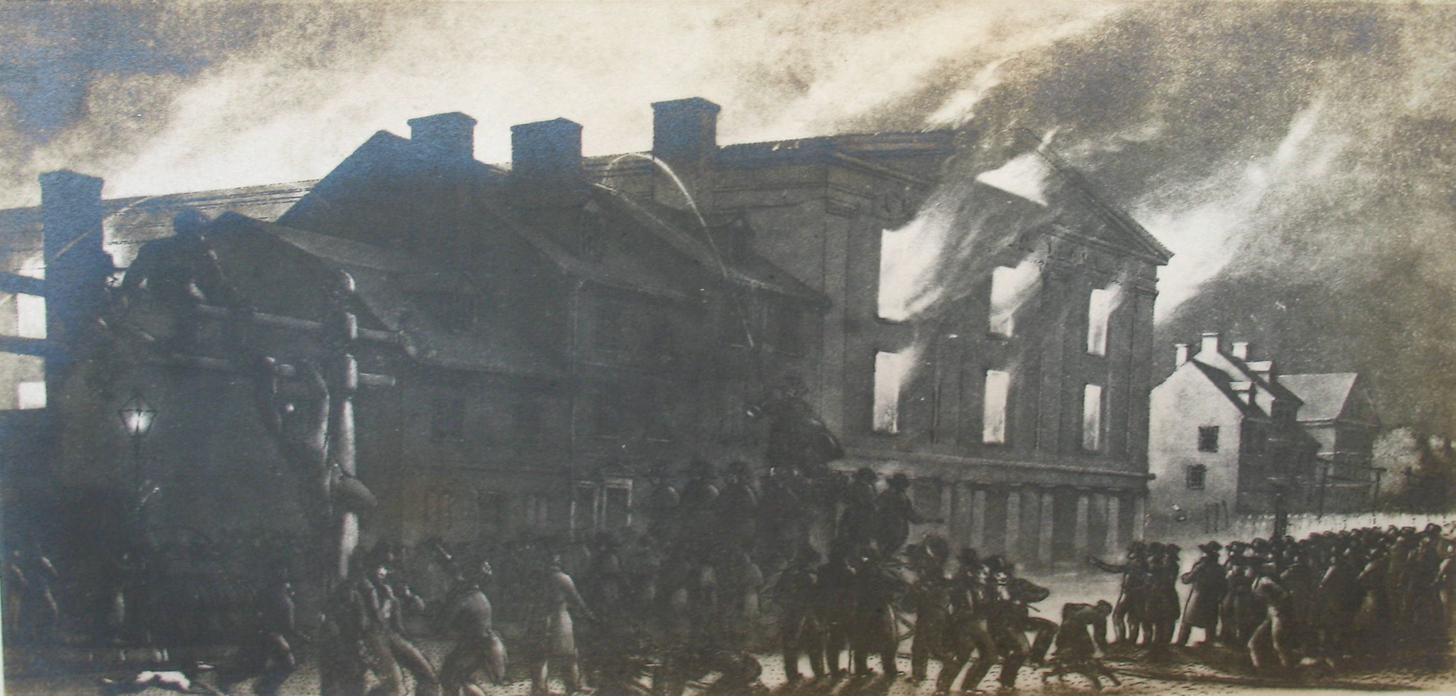 Engraving of the burning of Pennsylvania Hall in 1838- published in the book- History of Pennsylvania Hall- Which was destroyed by a mob- on the 17th of May- 1838 (Philadelphia: Printed by Merrihew and Gunn)