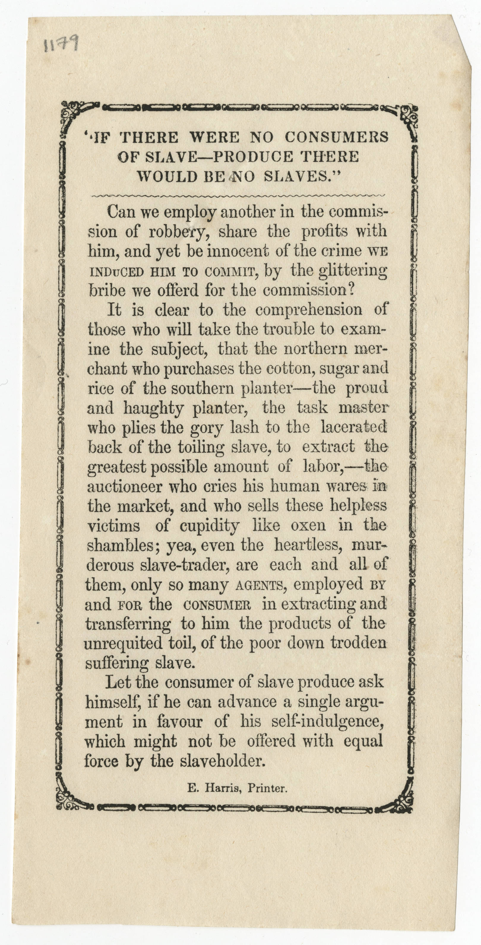 “If there were no consumers of slave-produce there would be no slaves,” HIST H252 The History of Haverford College: Conflict, Consensus and the Liberal Arts, accessed December 21, 2025, https://ds-omeka.haverford.edu/annotations/items/show/264.