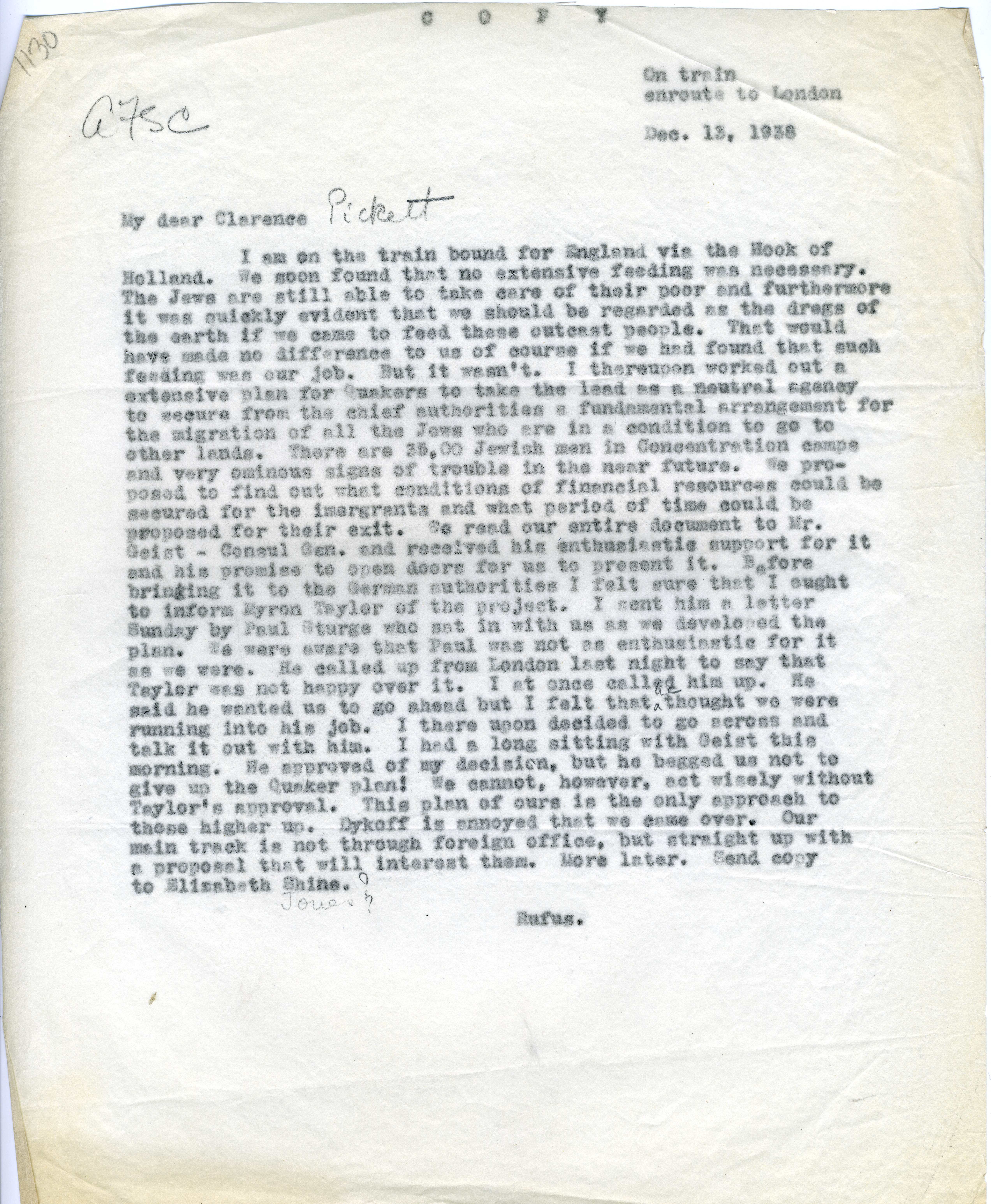 Letter from Rufus M. Jones to Clarence Pickett