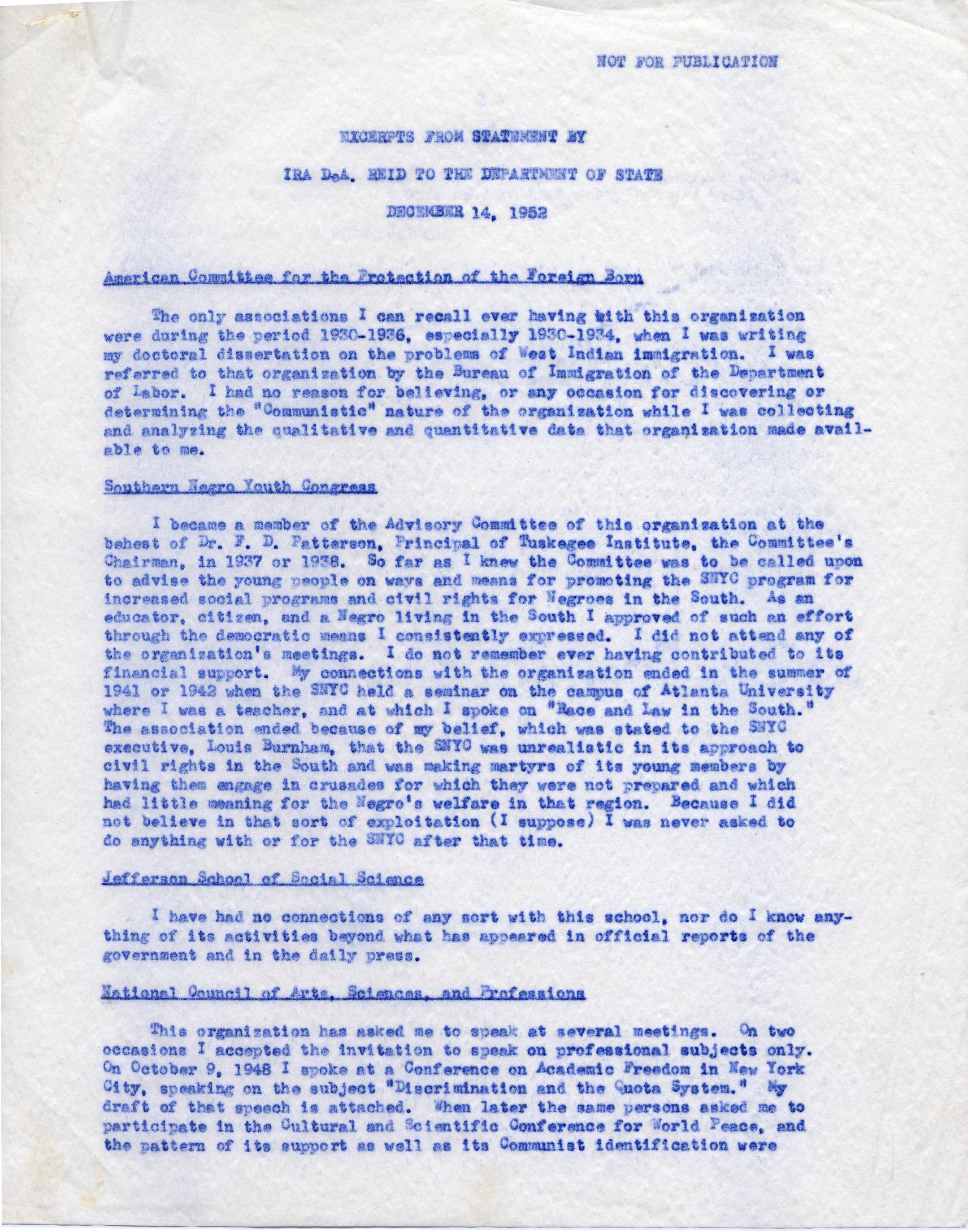 Reid- Ira De Augustine- 1902-1968, “Excerpts from Statement by Ira DeA Reid to the Department of State- December 14- 1952,” HIST H252 The History of Haverford College: Conflict, Consensus and the Liberal Arts, accessed December 21, 2025, https://ds-omeka.haverford.edu/annotations/items/show/47.