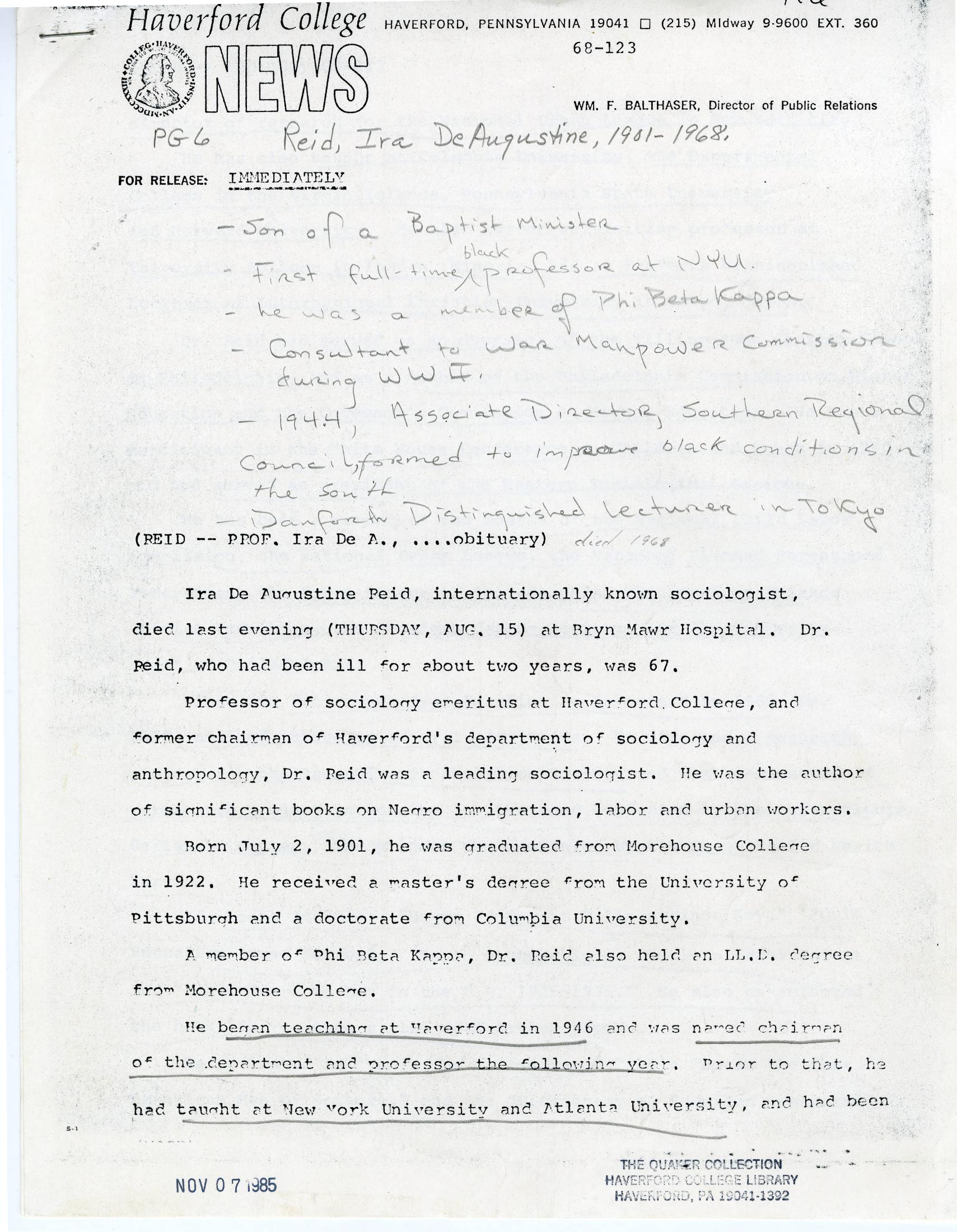 Haverford College News, “Reid -- Prof. Ira De A.... Obituar y,” HIST H252 The History of Haverford College: Conflict, Consensus and the Liberal Arts, accessed December 21, 2025, https://ds-omeka.haverford.edu/annotations/items/show/49.