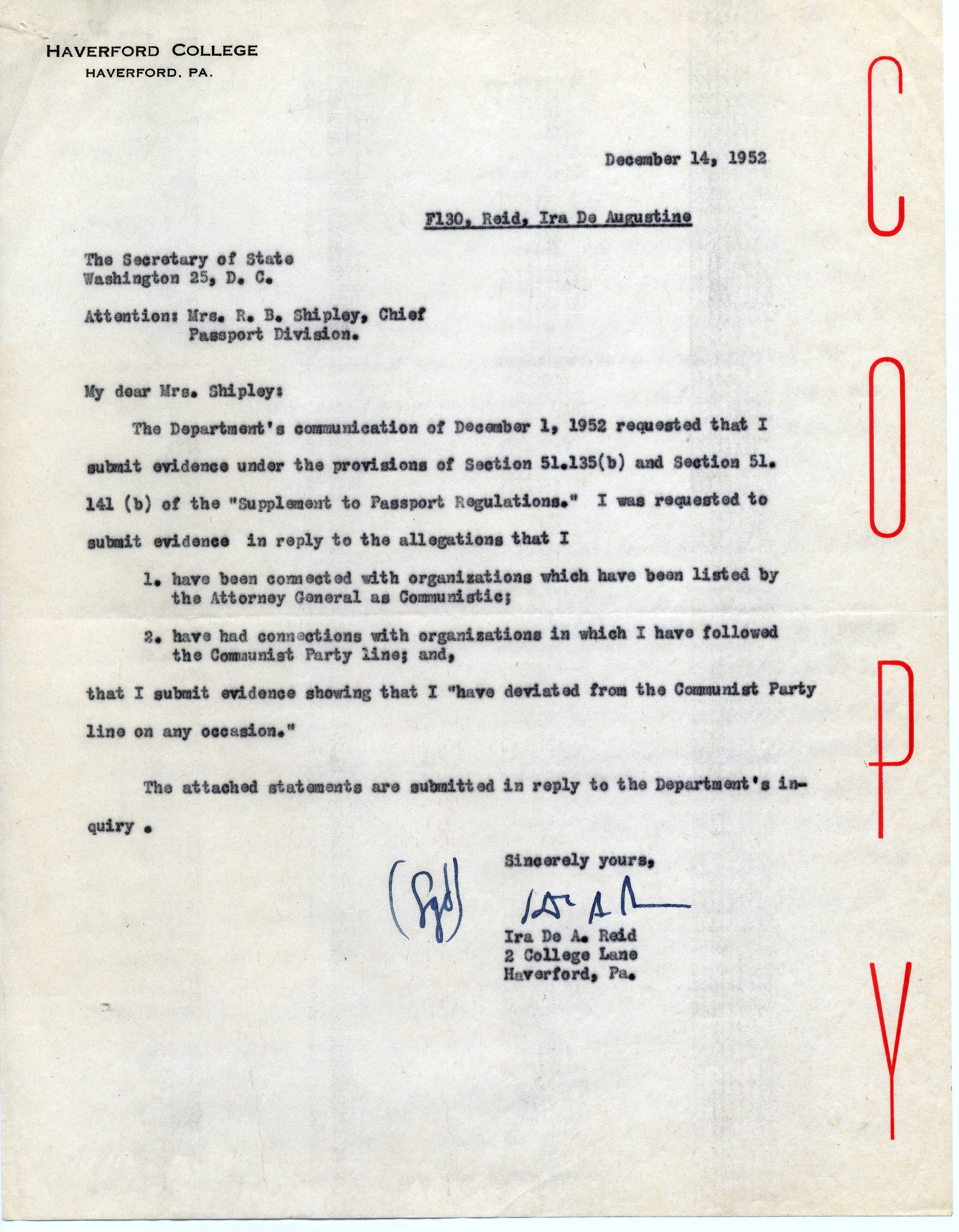 Reid- Ira De Augustine- 1902-1968, “Copy of Letter to R.B. (Ruth B.) Shipley- December 14- 1952,” HIST H252 The History of Haverford College: Conflict, Consensus and the Liberal Arts, accessed December 21, 2025, https://ds-omeka.haverford.edu/annotations/items/show/70.