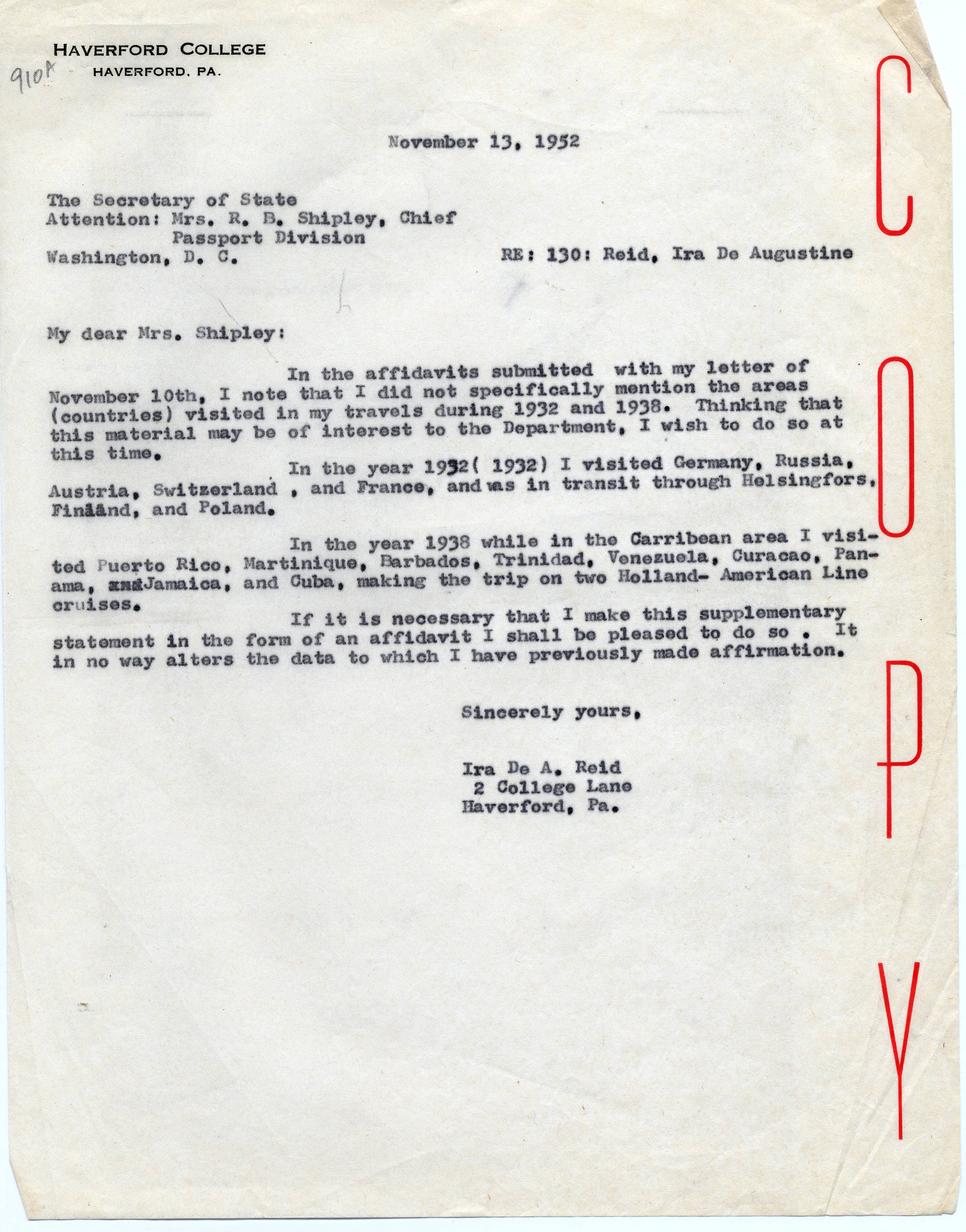 Reid- Ira De Augustine- 1902-1968, “Copy of Letter to R.B. (Ruth B.) Shipley- November 13- 1952,” HIST H252 The History of Haverford College: Conflict, Consensus and the Liberal Arts, accessed December 21, 2025, https://ds-omeka.haverford.edu/annotations/items/show/73.
