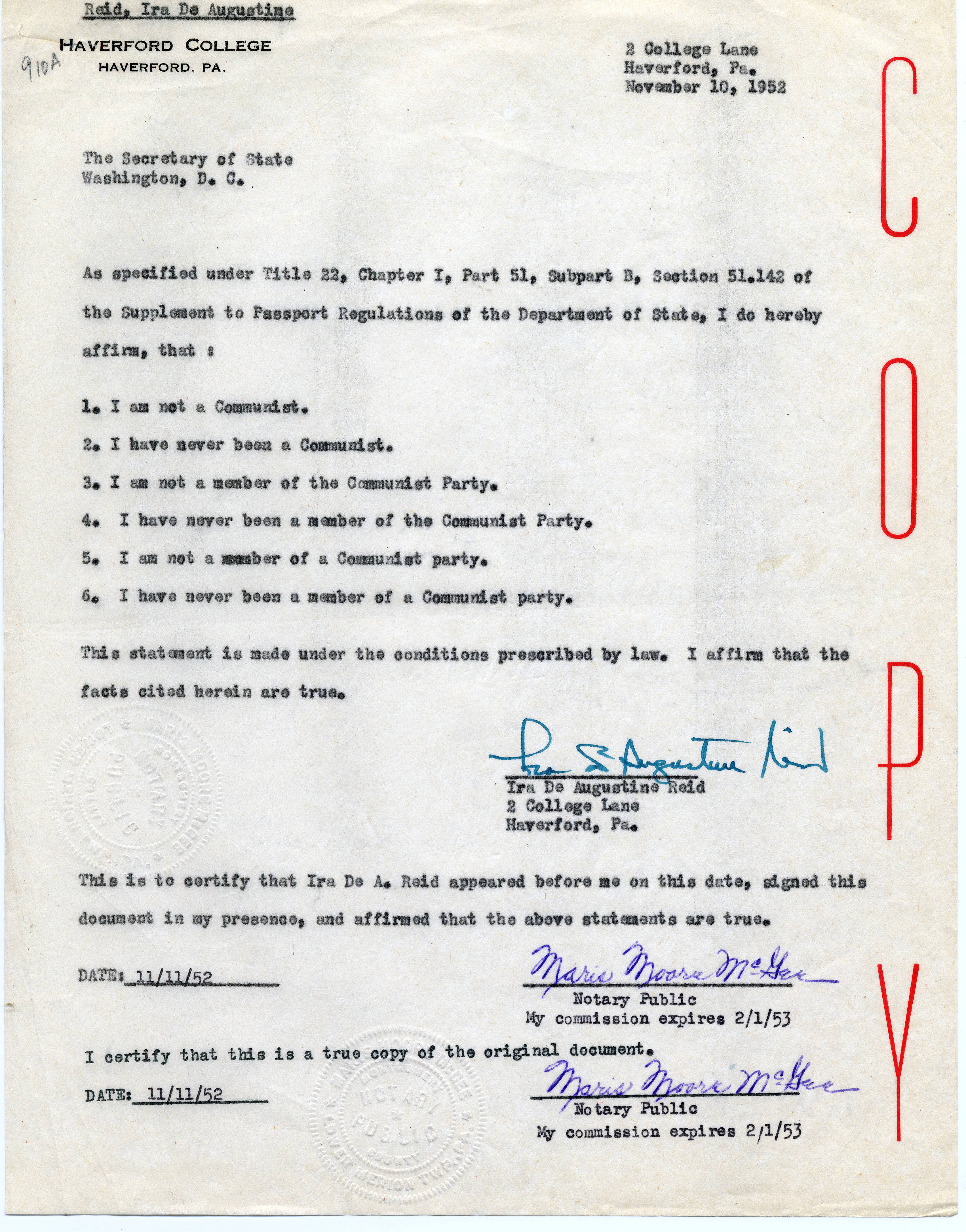 Reid- Ira De Augustine- 1902-1968, “Notarized Affirmation of Uninvolvement with Communist Party,” HIST H252 The History of Haverford College: Conflict, Consensus and the Liberal Arts, accessed December 21, 2025, https://ds-omeka.haverford.edu/annotations/items/show/74.