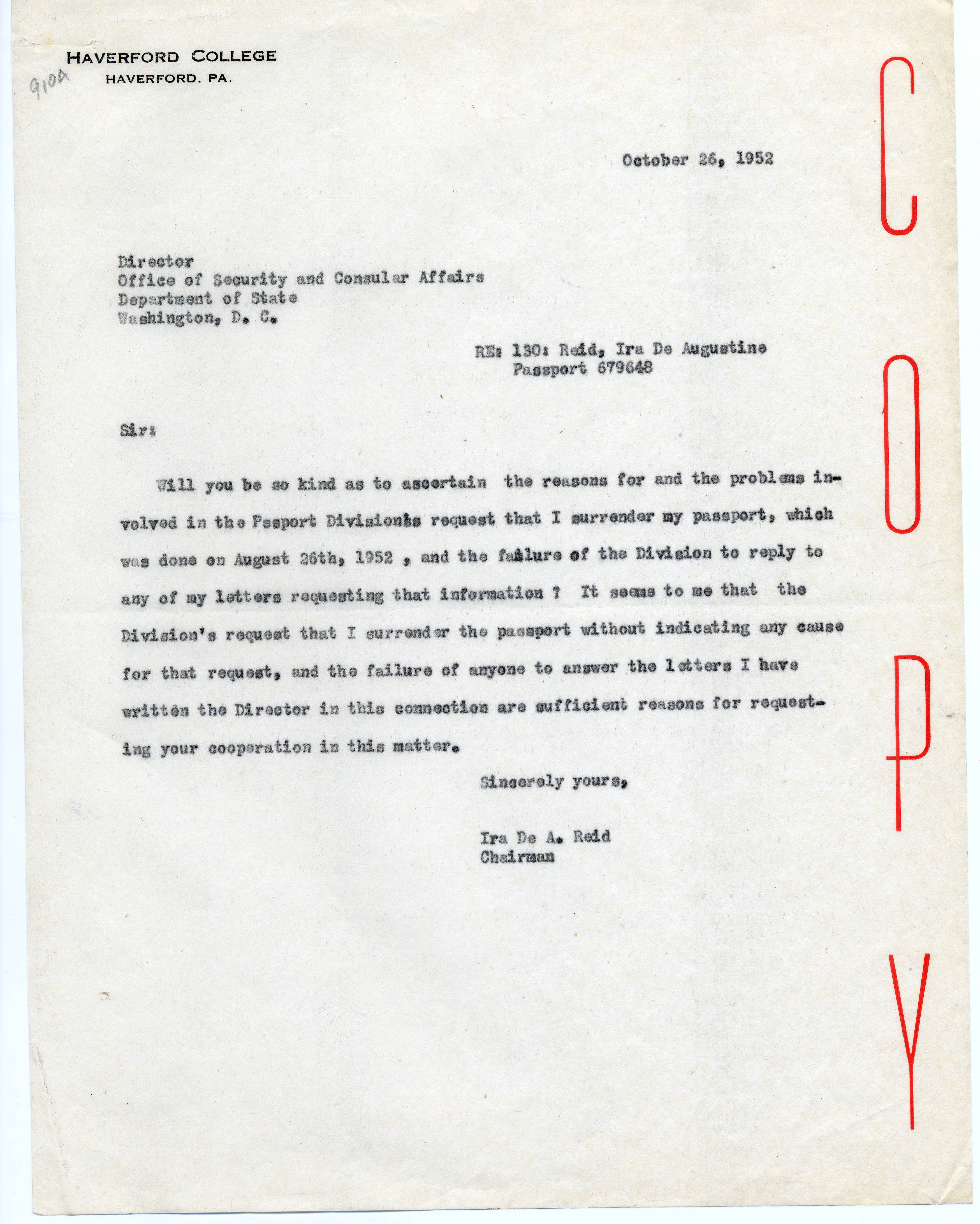 Reid- Ira De Augustine- 1902-1968, “Copy of letter to Director- Office of Security and Consular Affairs- United States Department of State- October 26- 1952,” HIST H252 The History of Haverford College: Conflict, Consensus and the Liberal Arts, accessed December 21, 2025, https://ds-omeka.haverford.edu/annotations/items/show/79.