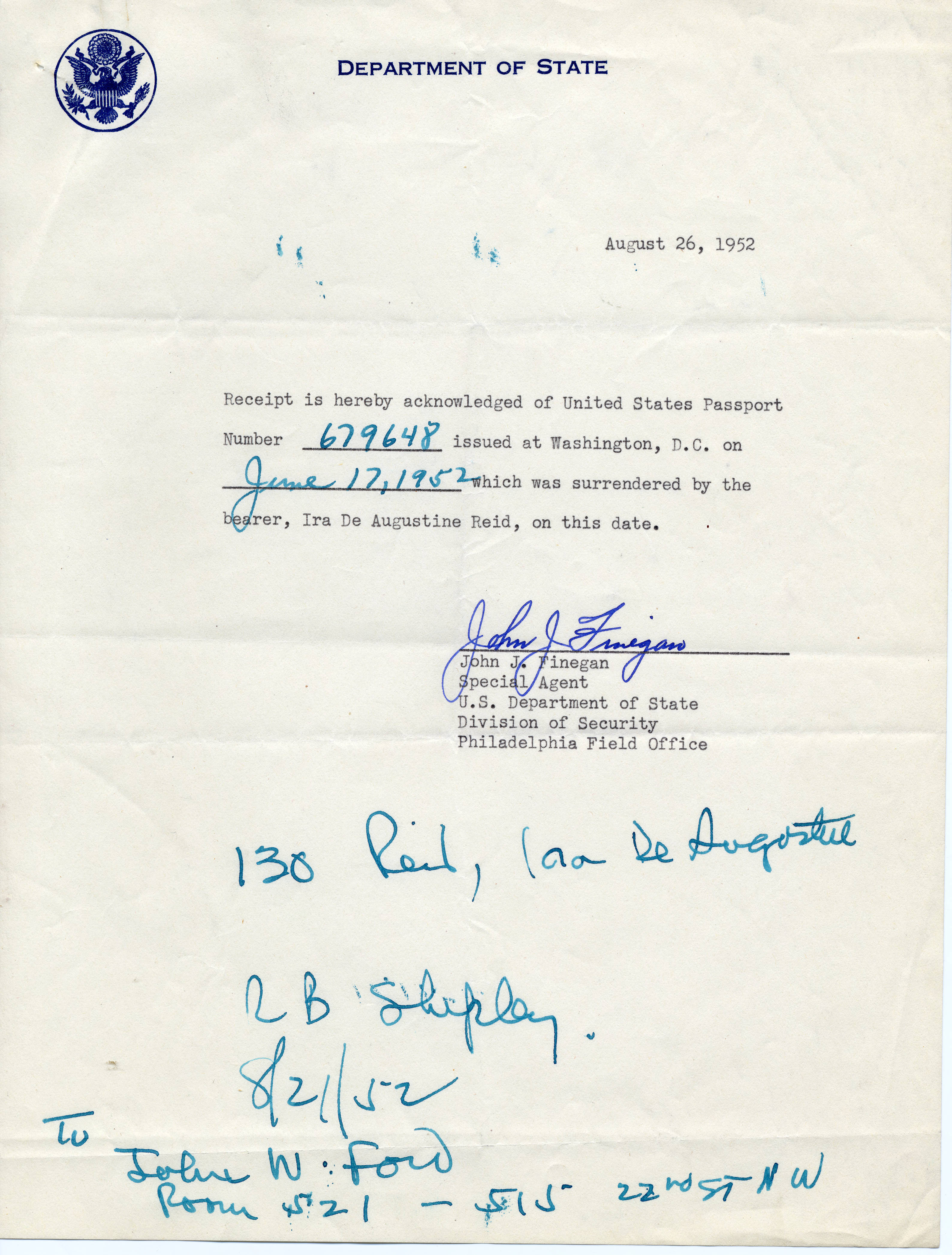 Receipt from United States Department of State to Ira De. A. Reid- August 26- 1952