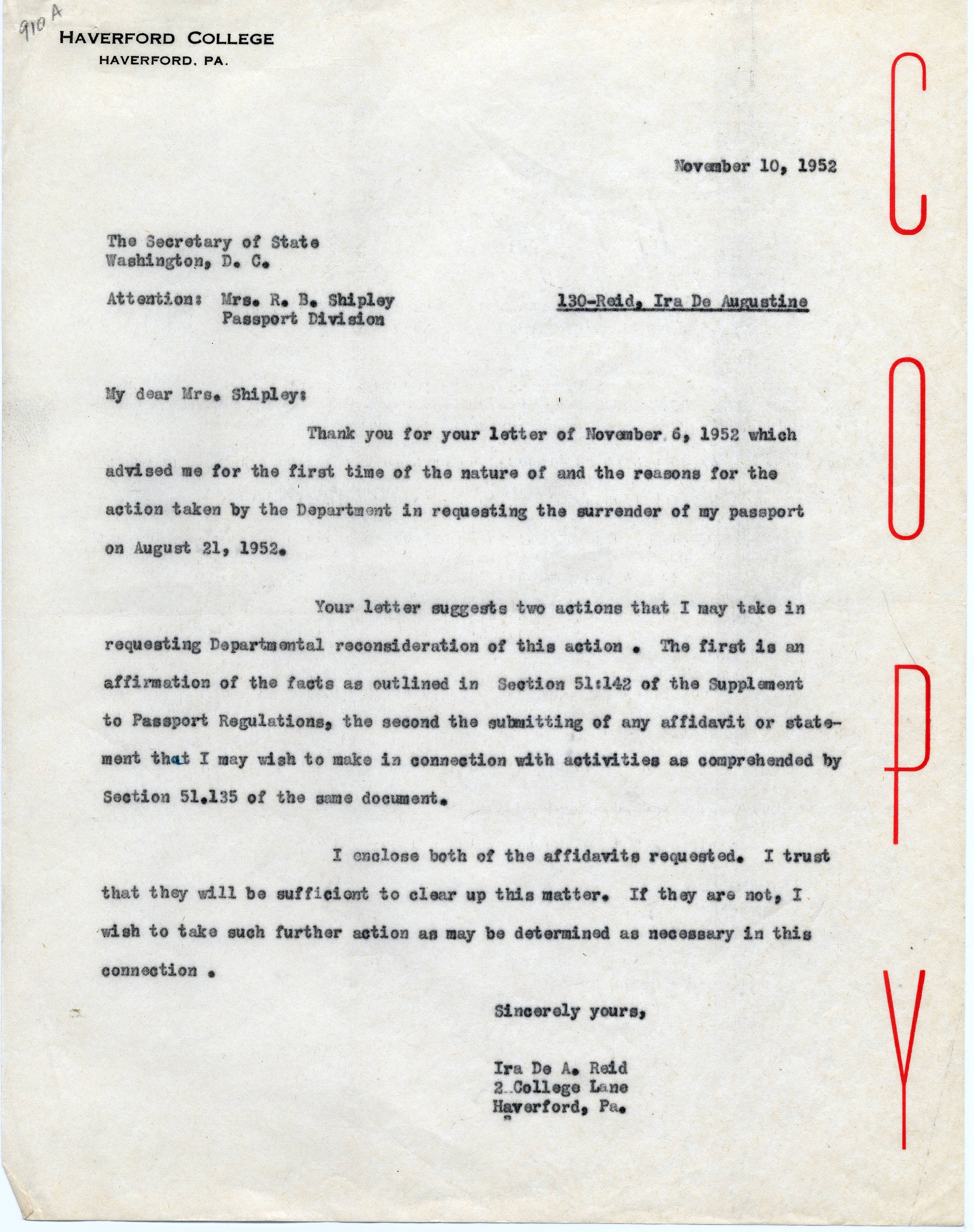 Reid- Ira De Augustine- 1902-1968, “Copy of Letter to R. B. (Ruth B) Shipley- November 10- 1952,” HIST H252 The History of Haverford College: Conflict, Consensus and the Liberal Arts, accessed December 21, 2025, https://ds-omeka.haverford.edu/annotations/items/show/83.