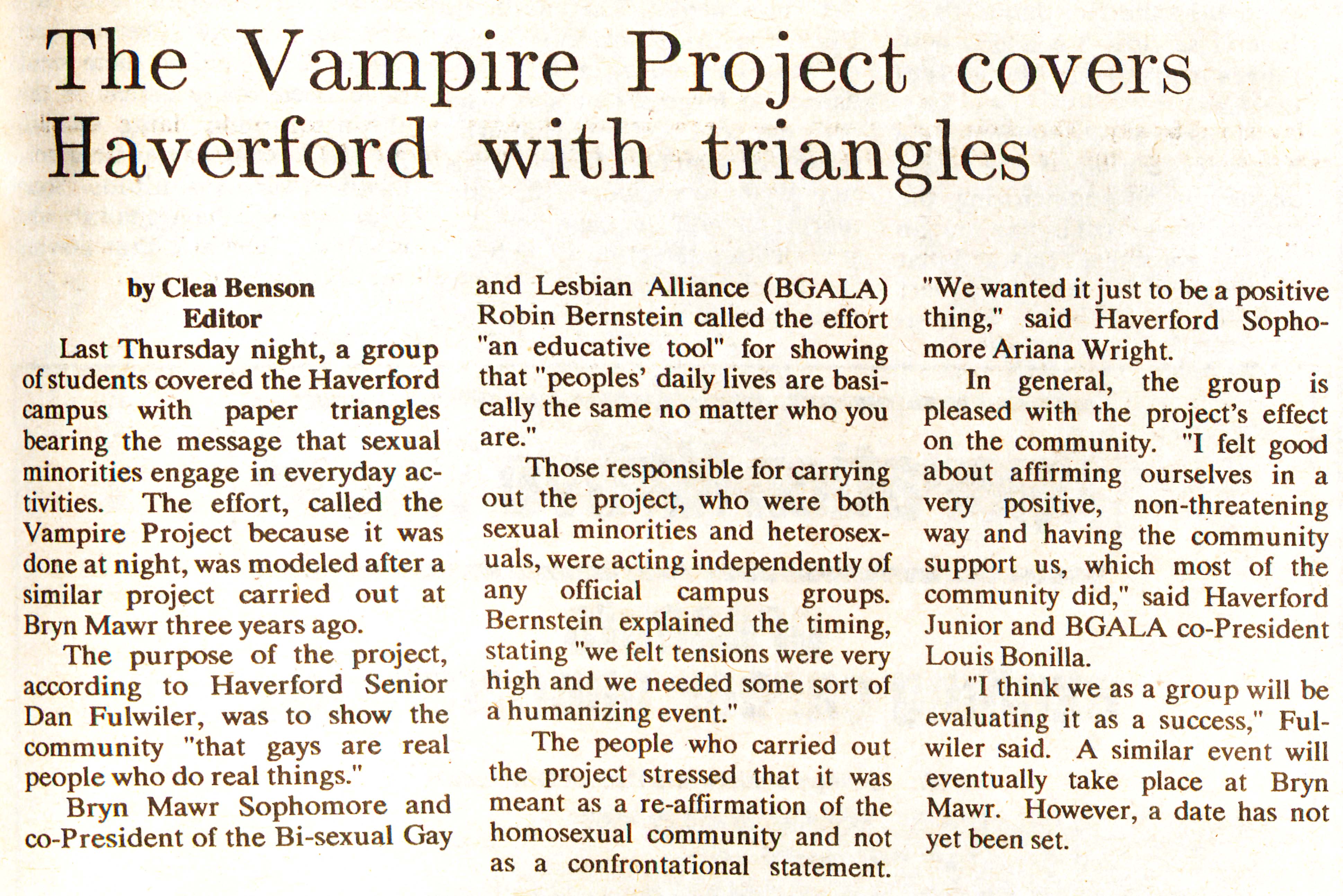“The Vampire Project covers Haverford with triangles ,” That Which is Renamed, but Always Remains: An Archival Representation of Queer History at Haverford College, accessed December 14, 2025, https://ds-omeka.haverford.edu/bechen/items/show/1283.