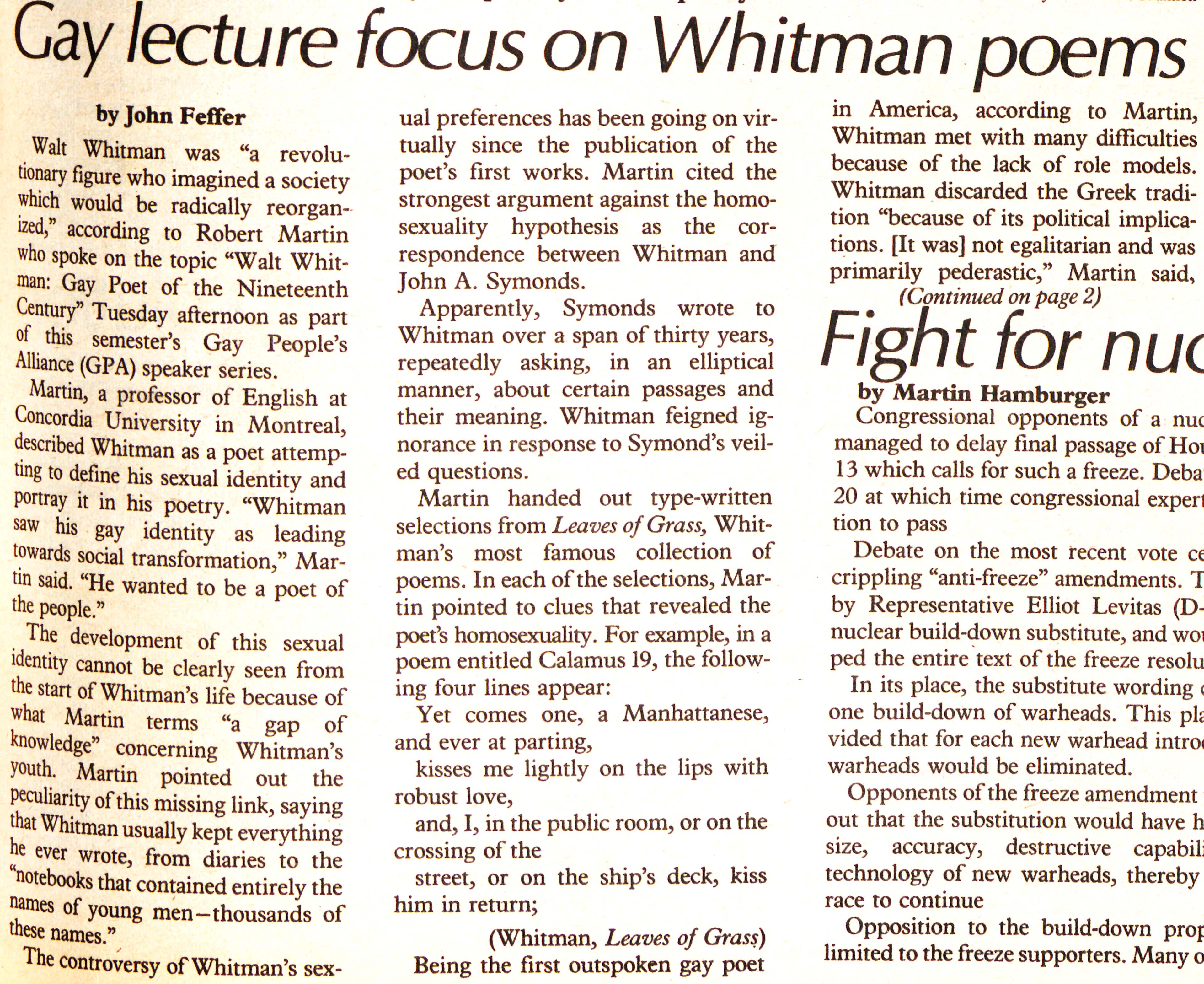 “Gay lecture focus on Whitman poems ,” That Which is Renamed, but Always Remains: An Archival Representation of Queer History at Haverford College, accessed December 14, 2025, https://ds-omeka.haverford.edu/bechen/items/show/1233.