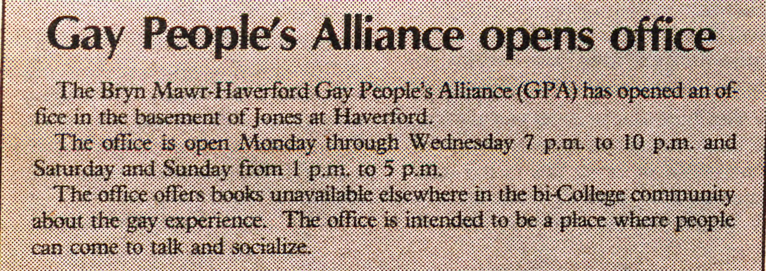 “Gay People's Alliance opens office,” That Which is Renamed, but Always Remains: An Archival Representation of Queer History at Haverford College, accessed December 13, 2025, https://ds-omeka.haverford.edu/bechen/items/show/1246.
