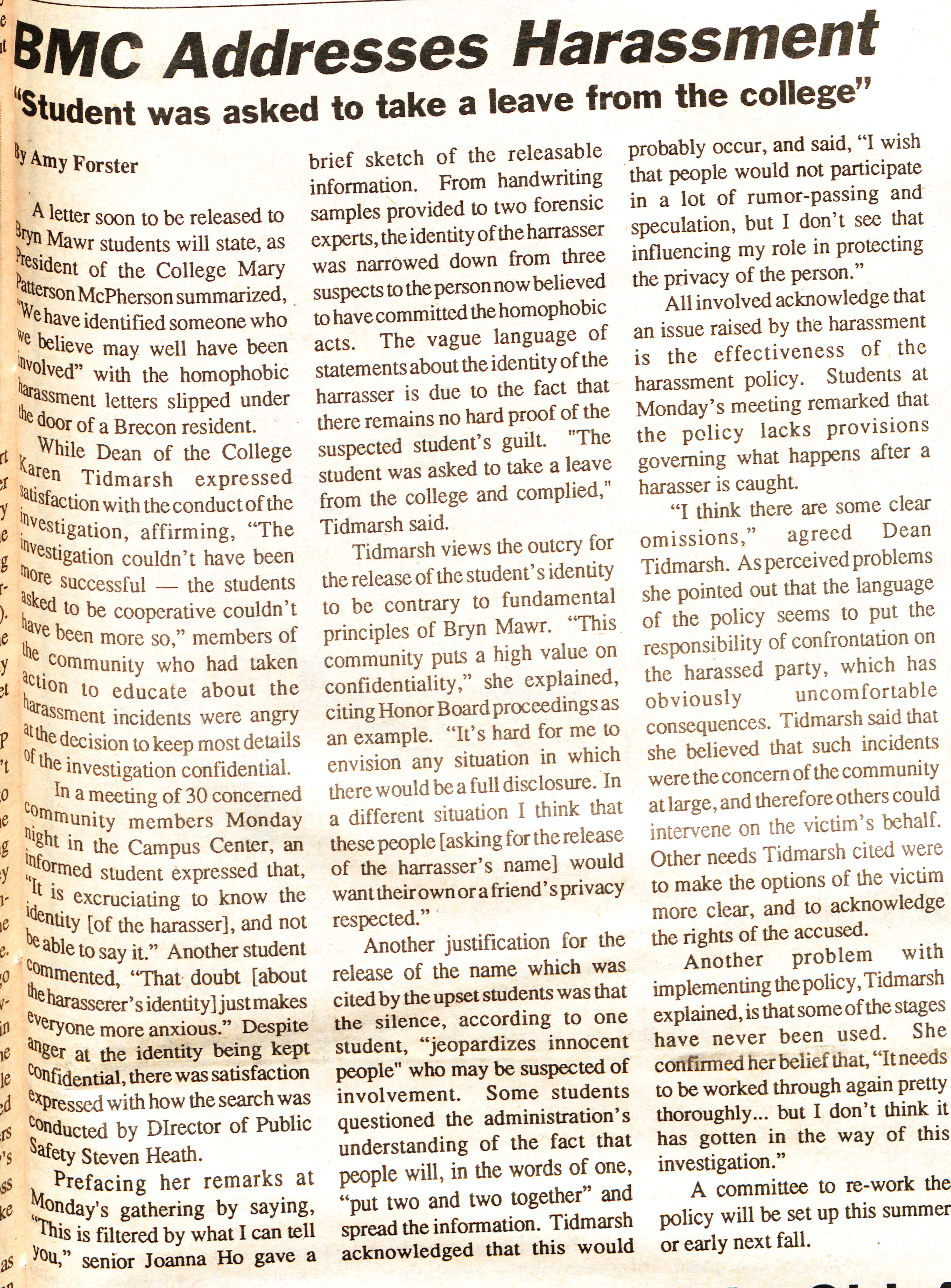 “BMC Addresses Harassment,” That Which is Renamed, but Always Remains: An Archival Representation of Queer History at Haverford College, accessed December 15, 2025, https://ds-omeka.haverford.edu/bechen/items/show/1300.