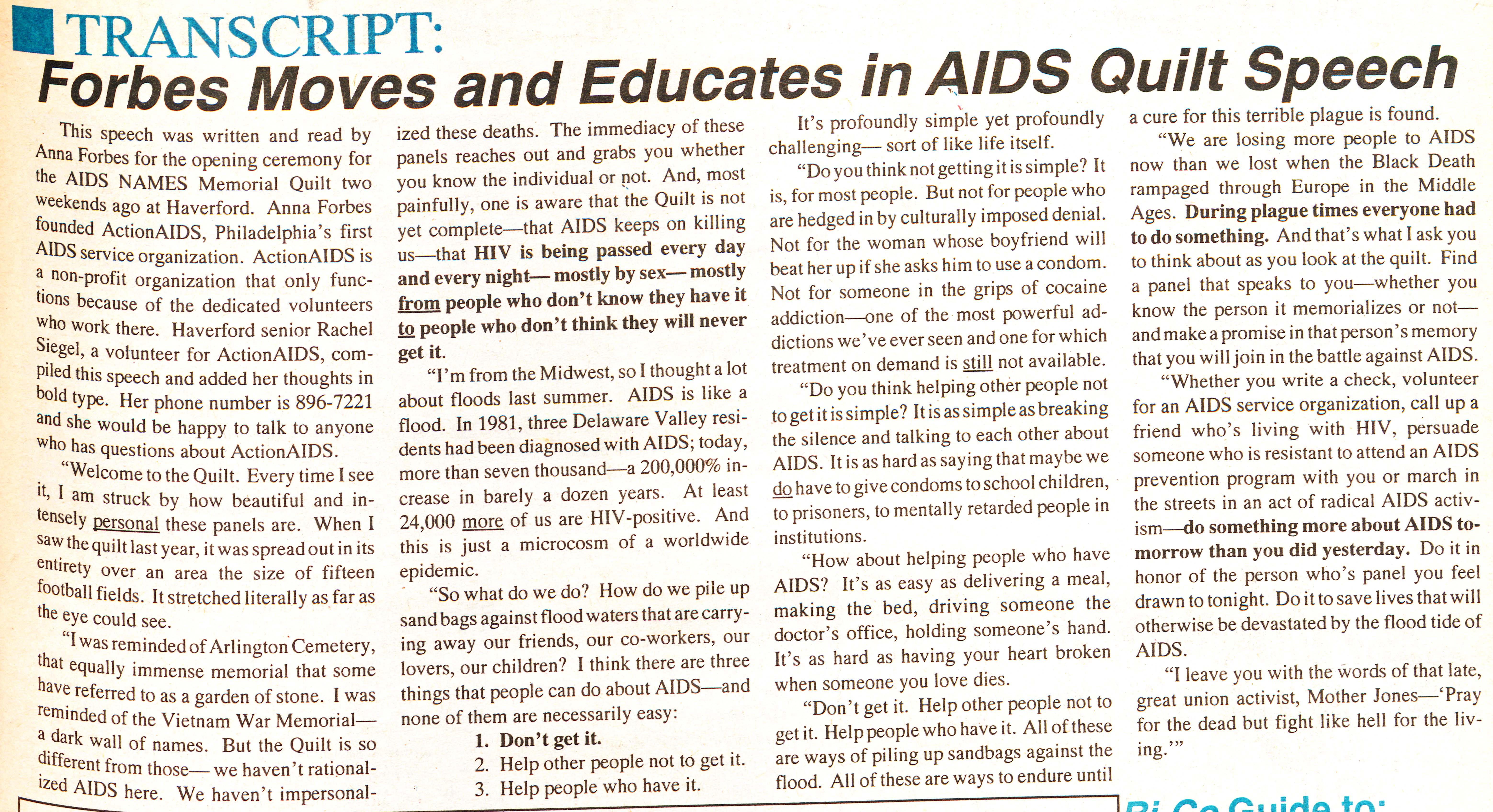Transcript of Anna Forbes' speech at the opening ceremony of the AIDS quilt showing at Haverford.