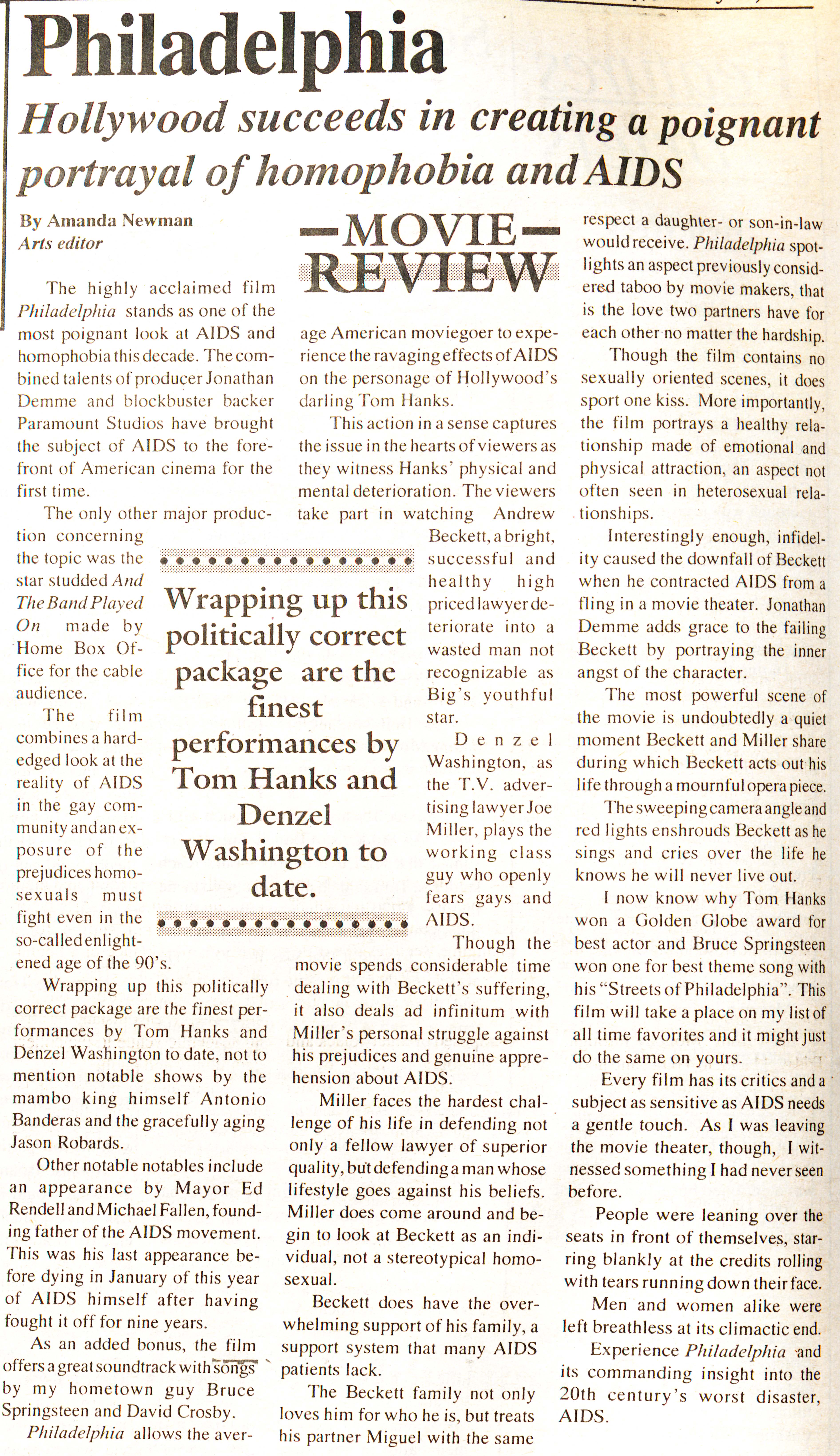 “Philadelphia: Hollywood succeeds in creating a poignant portrayal of homophobia and AIDS,” That Which is Renamed, but Always Remains: An Archival Representation of Queer History at Haverford College, accessed December 15, 2025, https://ds-omeka.haverford.edu/bechen/items/show/1324.