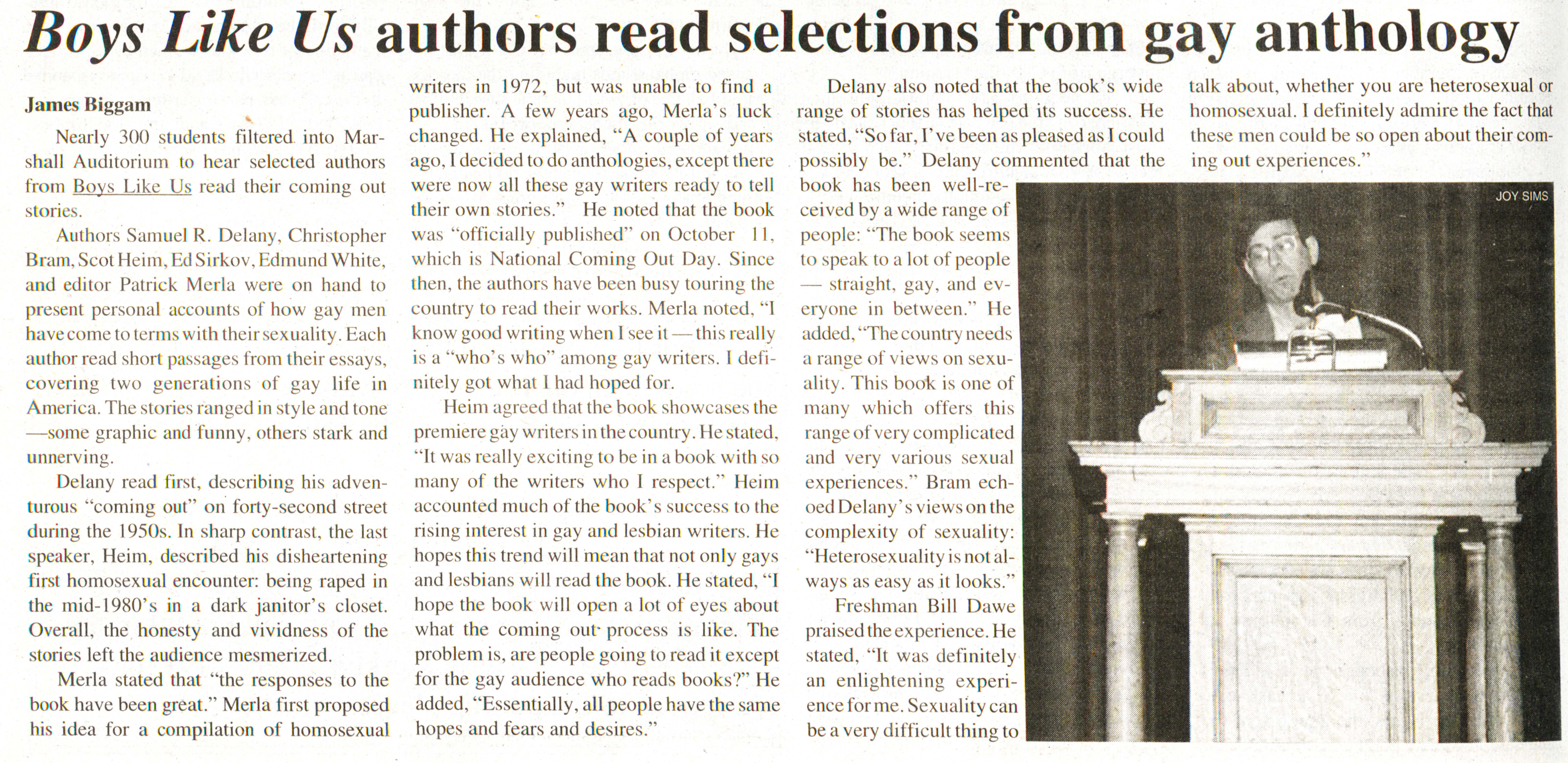 “Boys Like Us authors read selections from gay anthology ,” That Which is Renamed, but Always Remains: An Archival Representation of Queer History at Haverford College, accessed December 16, 2025, https://ds-omeka.haverford.edu/bechen/items/show/1346.