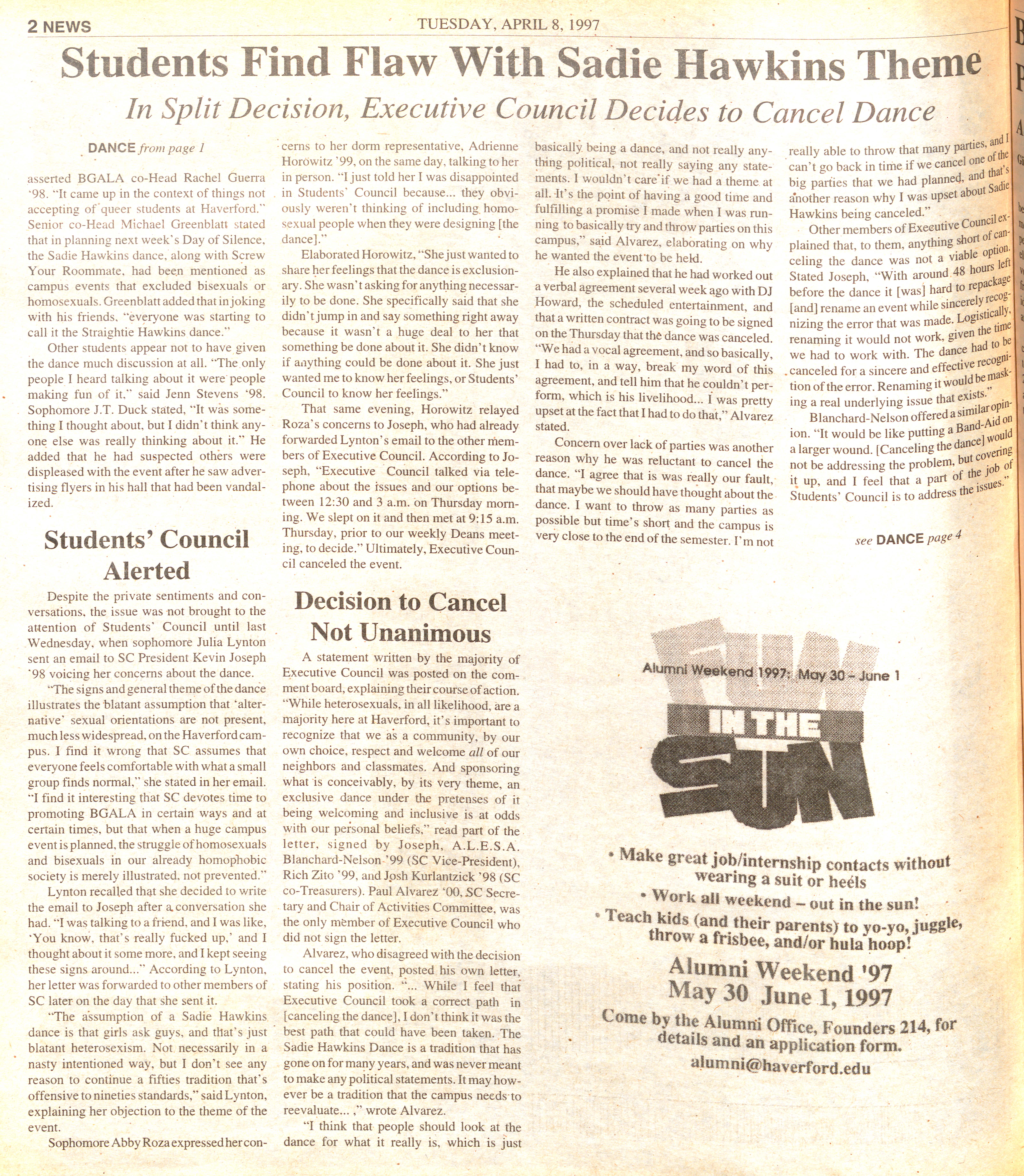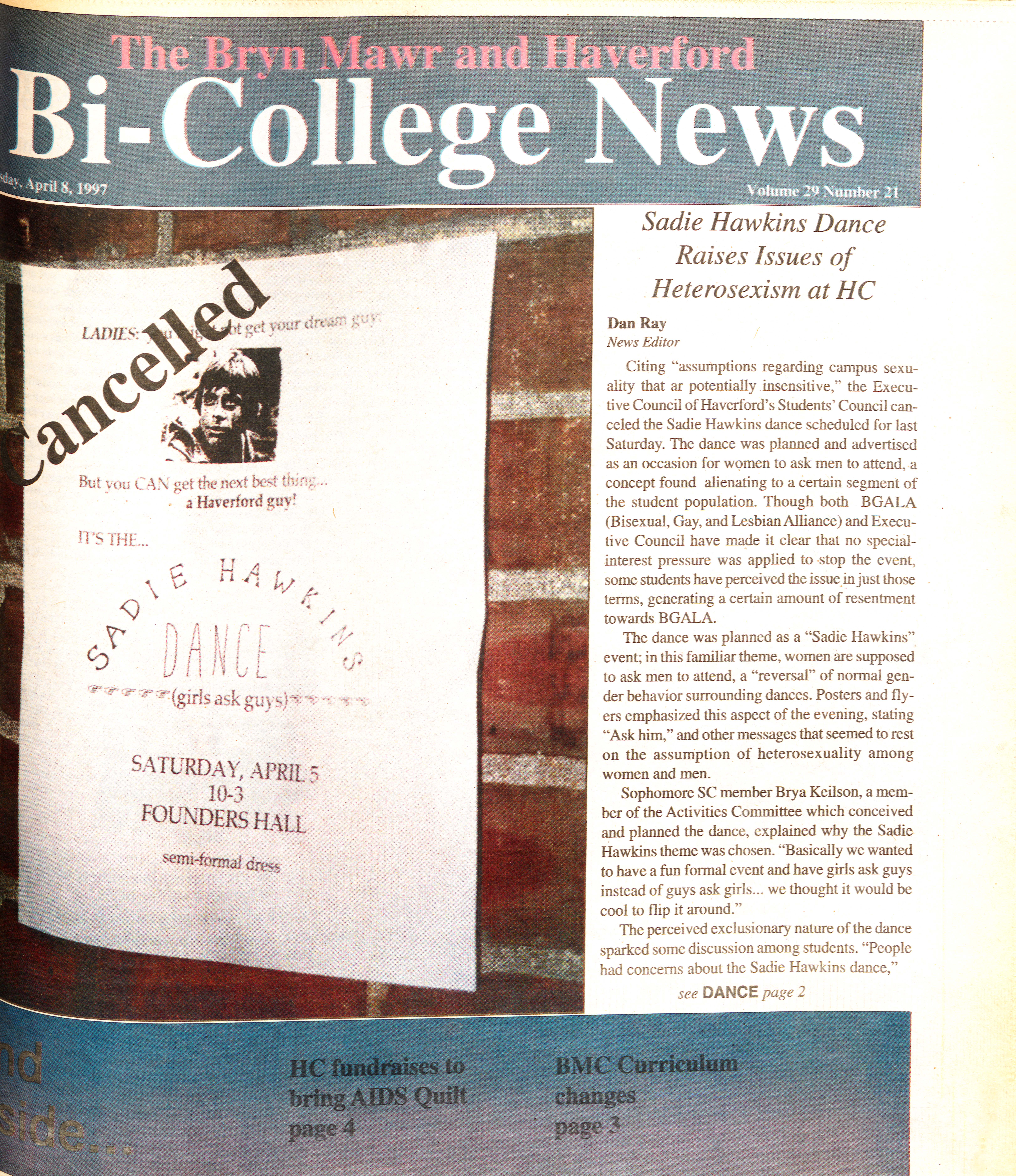 Article detailing the cancelling of the Sadie Hawkins Dance by Students Council for fears that it was heterosexist