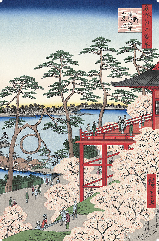Hiratsuka’s print of Shinobazu Pond is inverse of many prints in One Hundred Views of New Tokyo that capture the scenes of Tokyo in transition. This print of Shinobazu Pond takes people back in time. Instead of brick or concrete tall buildings, the print is filled with Japanese elements such as wooden buildings and a five-story pagoda in the back.