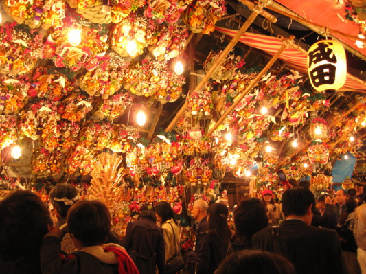 As in the print, in shrines, people bought Kumade-Mamori (rake-shaped amulets), wishing the prosperity of the following year.