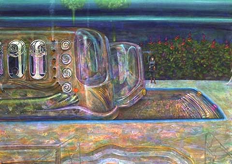 A siema, a kind of fantastical train, waits for passengers.