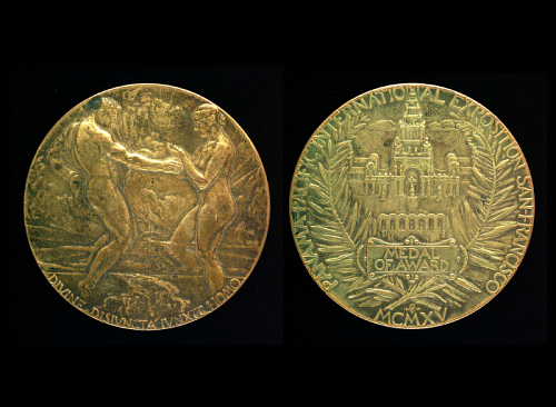 This metal was created by the committee of the Panama-Pacific International Exposition. On one side it reads "Panama-Pacific International Exposition San Francisco Metal of Award MCMXV [1915]". The building in the middle of the words appears to be the Tower of Jewels, one of the prominent buildings of the Exposition. On the other side of the metal there are two nude figures, one male and one female. They appear strong and healthy, seemingly allegorical figures representing the progress of America. As Moore writes in Empire on Display, the man used in much of the imagery associated with this Exposition is reminicient of Hercules, both visually and symplically. Further proof of this connection appears in the Latin phrase inscribed below the figures on the metal, which reads "What God has Divided, Man Joins”. This is a reference to the Panama Canal, the feat of technology celebrated at the Exposition. By constructing a waterway through Panama, American was able to connect the east and west in hitertho unheard of ways. The implications of the newfound ease of travel were inmense and long lasting. This metal serves as a physical artifact commemorating the impact of the Panama Canal for prosperity.
