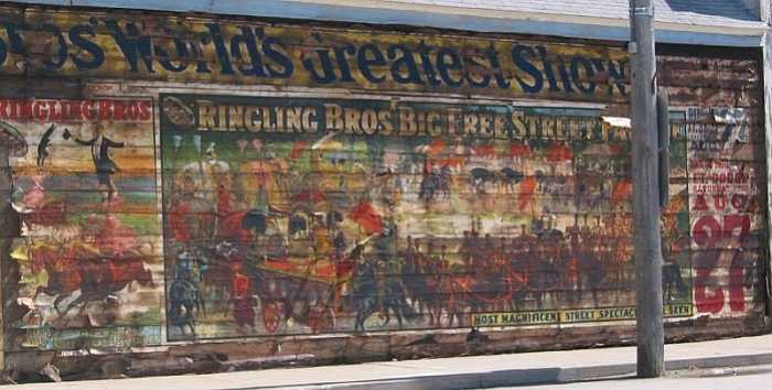 These are images of one poster that was painted on the side of a building. The poster was painted in 1910 in a farming town called Vincent in Iowa. The town has a population of about 200 which is interesting that the circus would set up in that town. The town is next to Fort Dodge which is where this poster is advertising the circus. The poster uses bright bold colors and many images of horses, parades, and people riding the horses. There is a large emphasis on the horses, as other images of the circus are not shown. The Ringling Brothers are shown in an oval medallion next to their name. In the background, an elephant is seen which shows that the brothers had an elephant in the show by 1910. The fact that the poster is on the side of a building is interesting because the circus would only be there for a day, but the poster remains and does not seem easily removable. The amount of detail in the painting and the large print really draws the eye into the picture to see exactly what the circus has to offer, and the large print is easily readable from the street. The bottom right says it is the “Most magnificent street spectacle ever seen” which makes it seem that the circus was performing a show on the street and not really setting up any grounds. It seems more like a parade than a show.