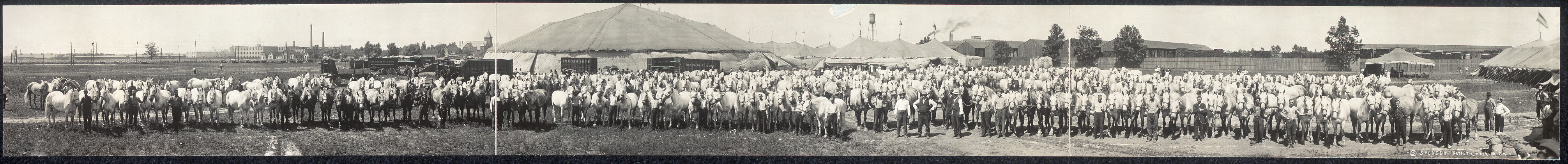 In this photograph, there is interesting focus on the non-spectacular of the circus—there are no large crowds, the tents are in the background, and no performers are presenter. What is spectacular is simply the sheer number of horses in comparison to the background. The panorama achieves this by showing the viewer the immensity of empty land the relatively normal town. Spencer expands the normal, human scale view and yet still dwarfs everything with the work-horses. One can see the temporal nature of the circus—the circus tents, clearly made of cloth, seem to disappear behind the sheer mass of the animals in front of them. He shifts the focus of the spectacle to the power of it, showing the magnitude of just one portion of the laboring population—horses. One can see, almost in motion, just how a circus would sweep through a town, the stable power, the temporary structures--one dwarfing the other, but both giants in front of the town itself.