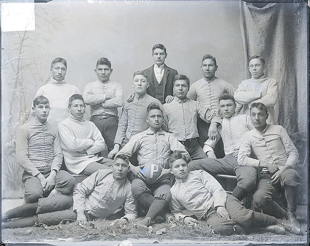 The picture itself is fairly "uneventful" the photo simply shows a team of Native Americans in their college football team. I believe that the strongest message that this imagery exhibits is that it shows the complete transition of culture for these Native Americans. No longer are they a part of the "stereotypical" Native that is presented in images. But they seem almost completely converted and I feel this way because of their clothes, their hair, the very sport they are playing. All of which are Western ideals. However I find their cold face reminiscent of older Native photos.