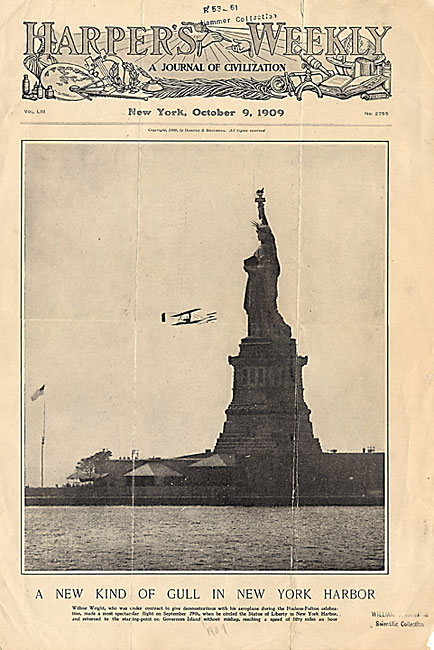 "This image shows the front page of the Oct. 9, 1909, issue of Harper’s Weekly. It captures Wilbur Wright as he flies around the Statue of Liberty in an early Wright Type A Flyer Sept. 29, 1909, during the Hudson-Fulton Celebration. The issue is titled, “A New Kind of Gull in New York Harbor.”" -http://newsdesk.si.edu/snapshot/harpers-weekly Smithsonian