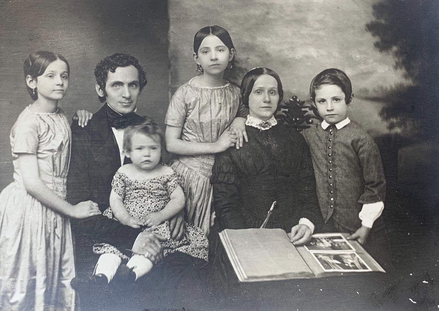 Portrait of a middle class family with their scrapbook. Samuel Mickle Hopper and Deborah Lavinia Vandersluce Hopper with children. The child on the lap is Harry Samuel Hopper. The names of the other children are unknown.