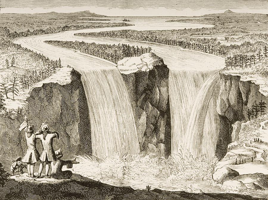 Copy of Father Hennepin's 1677 sketch of Niagara Falls, reprinted in 1870s. From "American Pictures Drawn With Pen And Pencil" by Rev Samuel Manning, circa 1880.