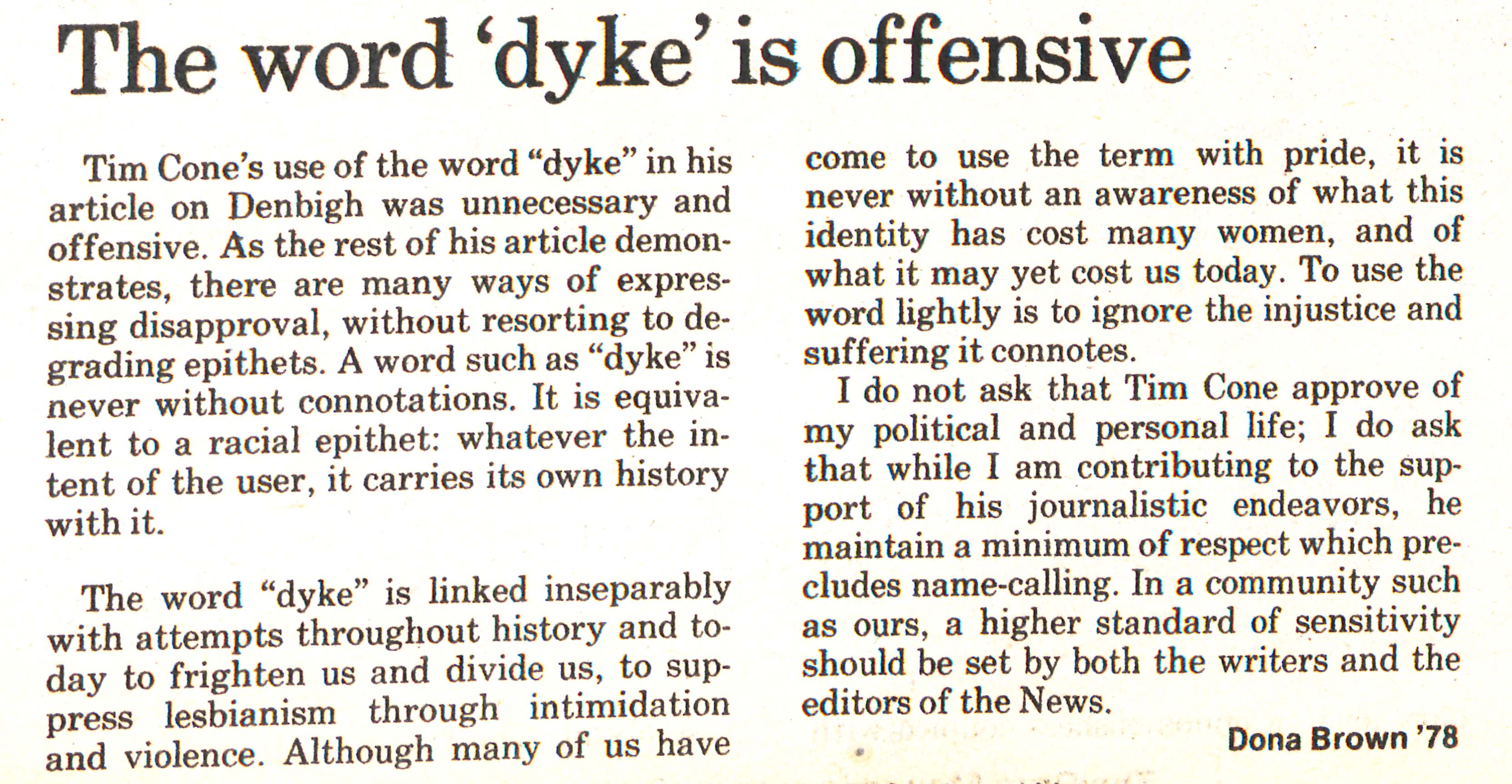“The word 'dyke' is offensive,” That Which is Renamed, but Always Remains: An Archival Representation of Queer History at Haverford College, accessed December 13, 2025, https://ds-omeka.haverford.edu/remainhaverford/items/show/1207.