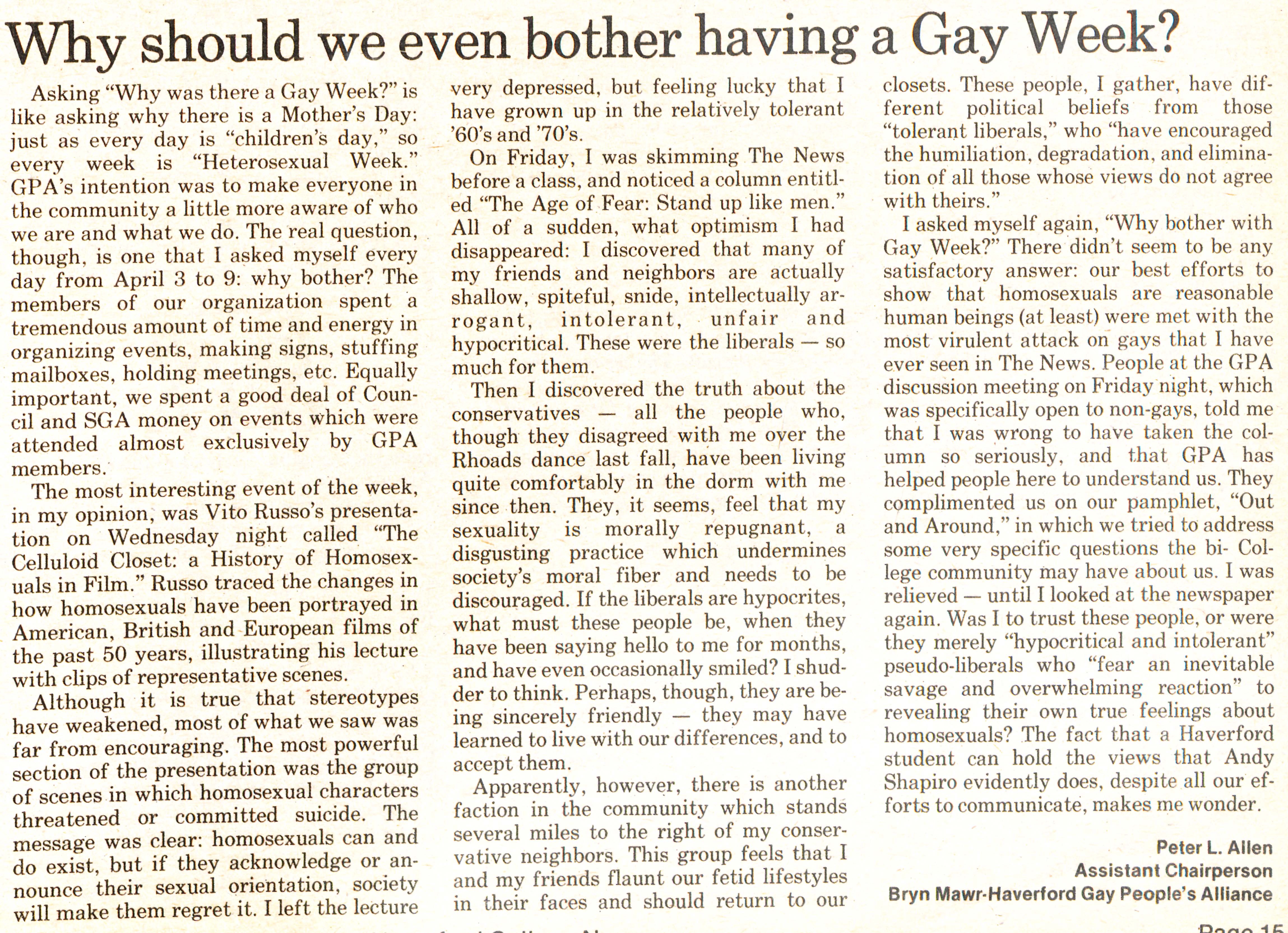 “Why should we even bother having a Gay Week? ,” That Which is Renamed, but Always Remains: An Archival Representation of Queer History at Haverford College, accessed December 13, 2025, https://ds-omeka.haverford.edu/remainhaverford/items/show/1213.