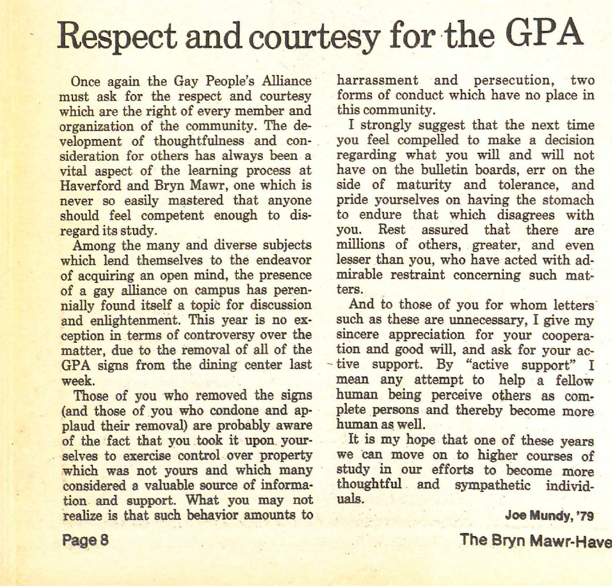 “Respect and courtesy for the GPA,” That Which is Renamed, but Always Remains: An Archival Representation of Queer History at Haverford College, accessed December 13, 2025, https://ds-omeka.haverford.edu/remainhaverford/items/show/1214.