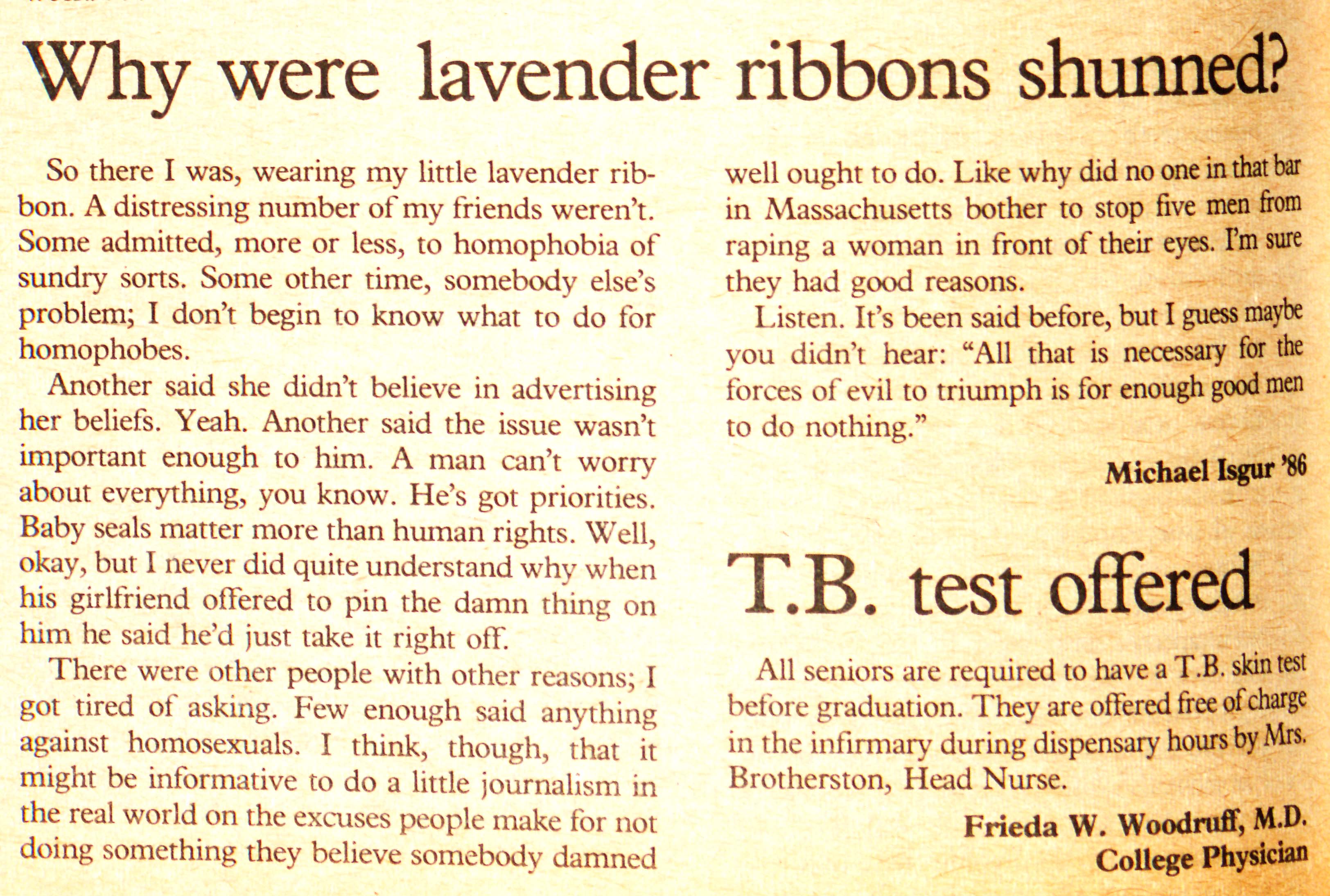 “Why were lavender ribbons shunned?,” That Which is Renamed, but Always Remains: An Archival Representation of Queer History at Haverford College, accessed December 13, 2025, https://ds-omeka.haverford.edu/remainhaverford/items/show/1239.