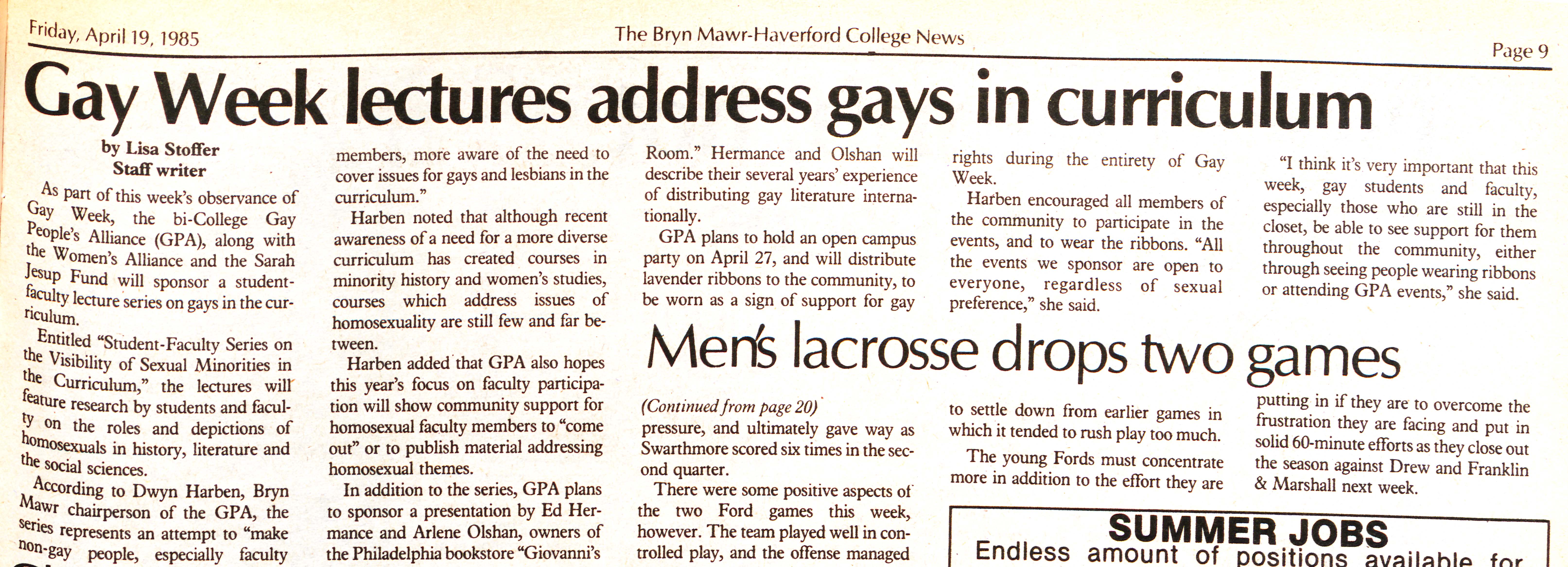 “Gay Week lectures address gays in curriculum ,” That Which is Renamed, but Always Remains: An Archival Representation of Queer History at Haverford College, accessed December 13, 2025, https://ds-omeka.haverford.edu/remainhaverford/items/show/1247.