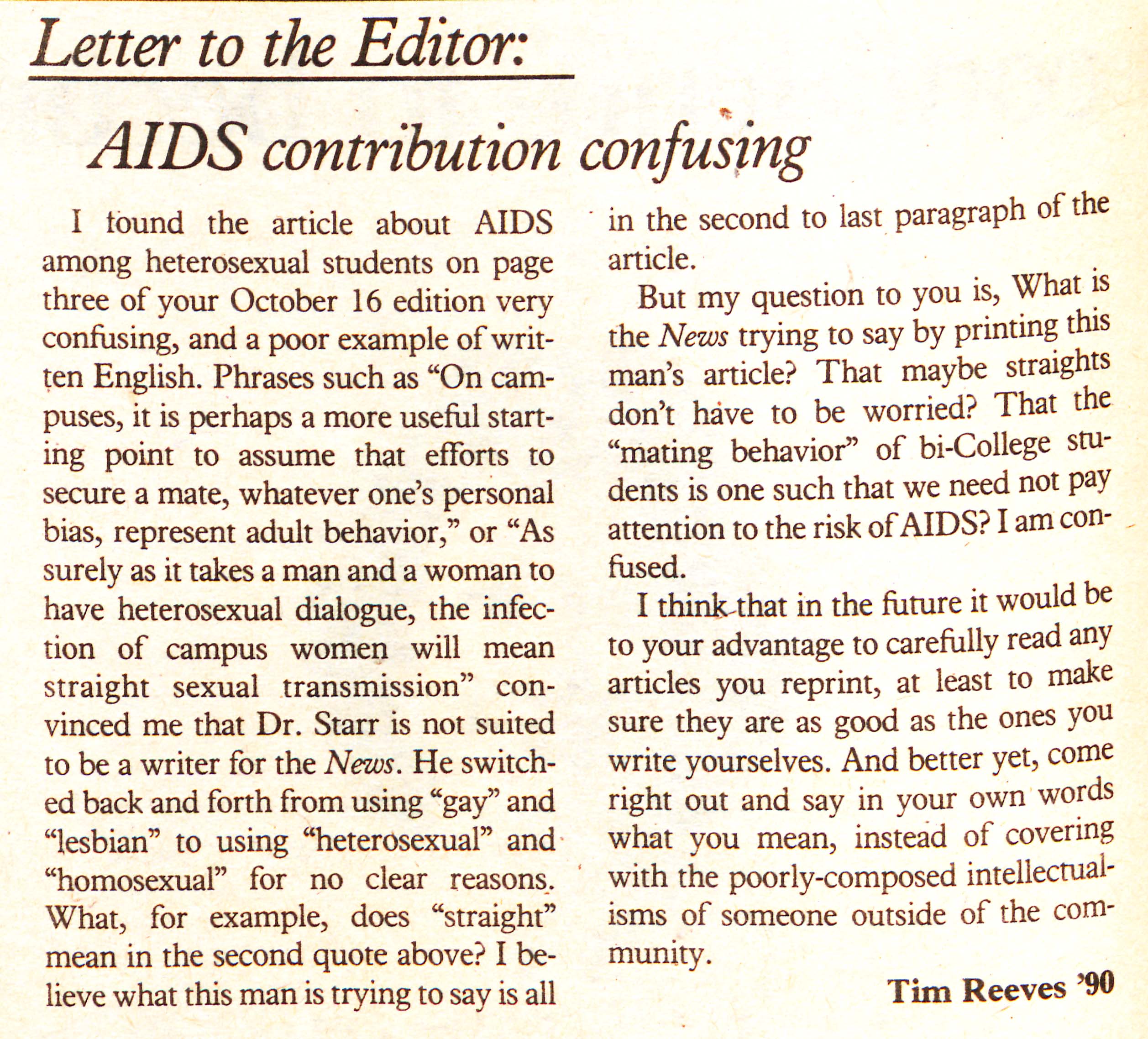 Letter to the editor critizing article covering AIDS in the previous week.