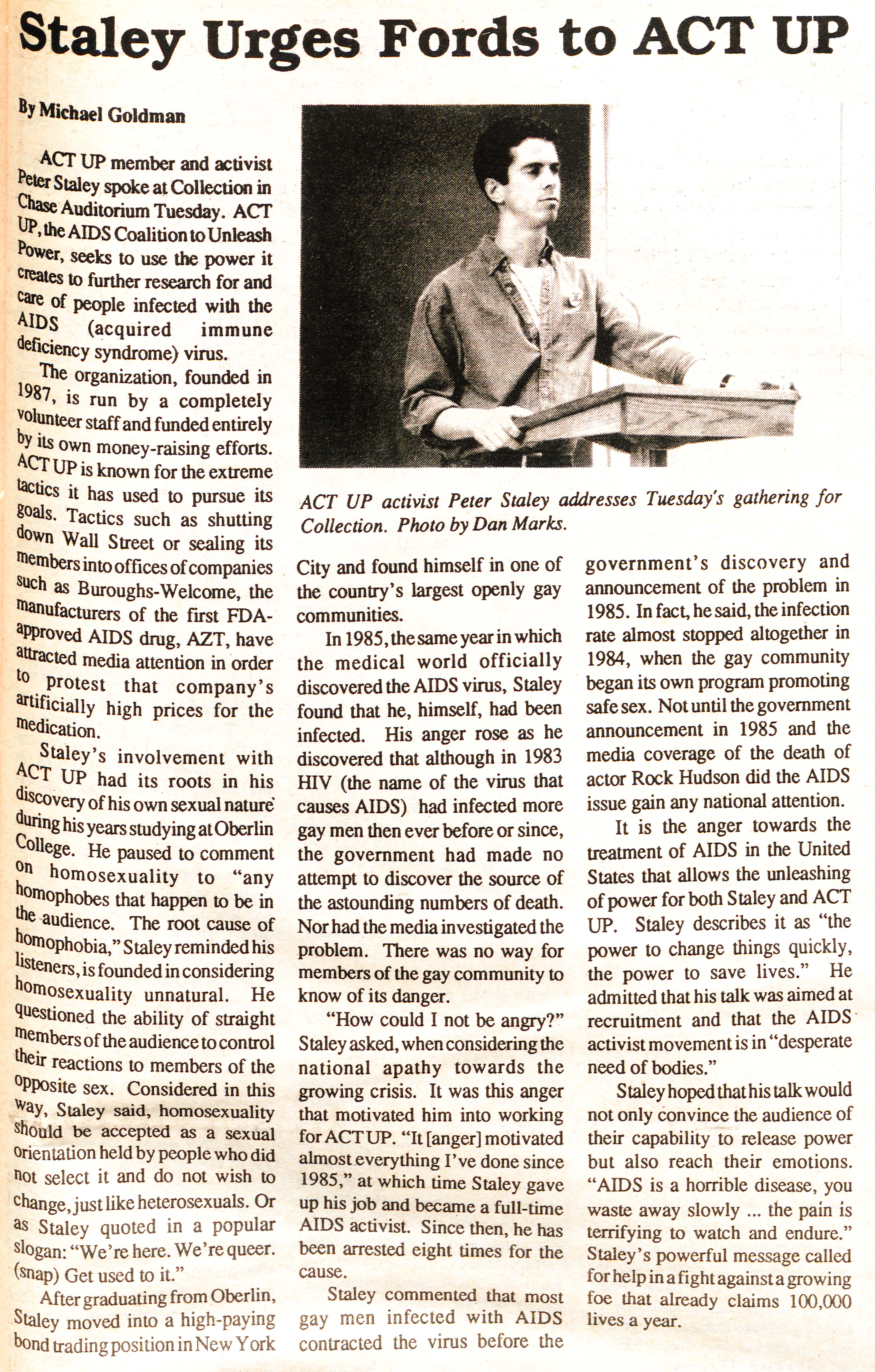 Article descibing a visting speaker from ACT-UP (AIDS Coalition to Unrelease Power)