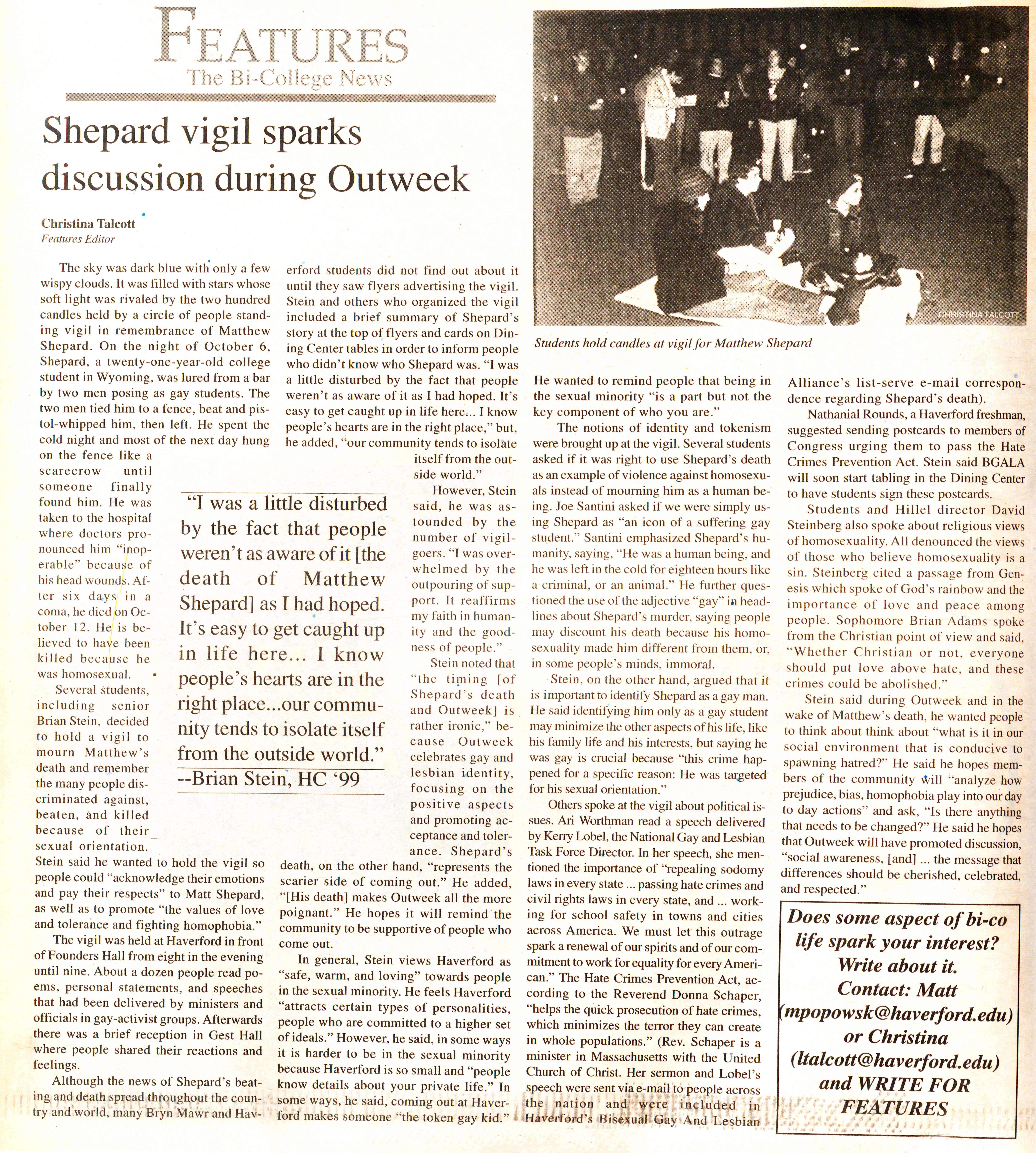 “Shepard vigil sparks discussion during Outweek ,” That Which is Renamed, but Always Remains: An Archival Representation of Queer History at Haverford College, accessed December 13, 2025, https://ds-omeka.haverford.edu/remainhaverford/items/show/1378.