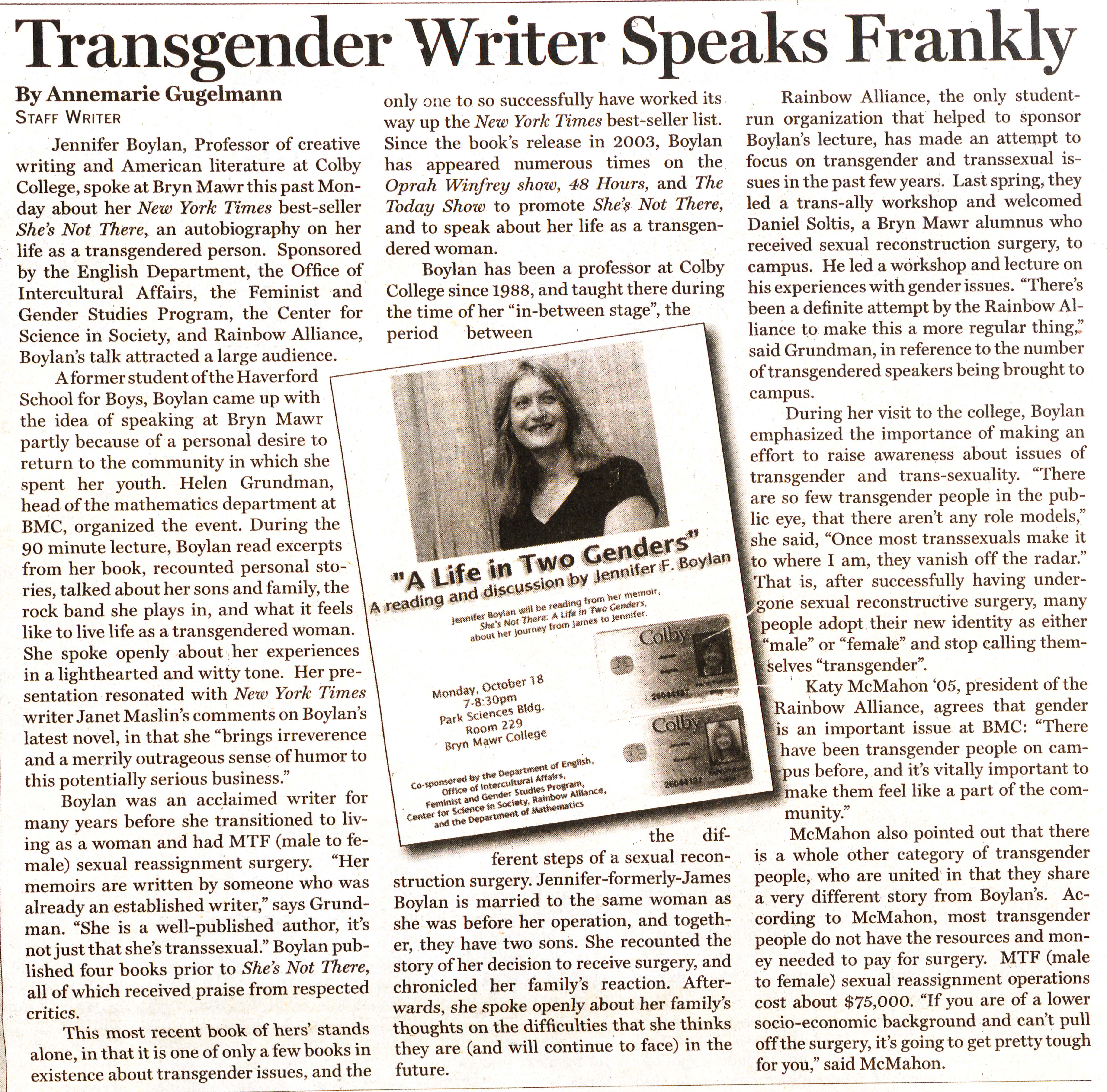 Coverage of a lecture at Bryn Mawr by Jennifer Boylan